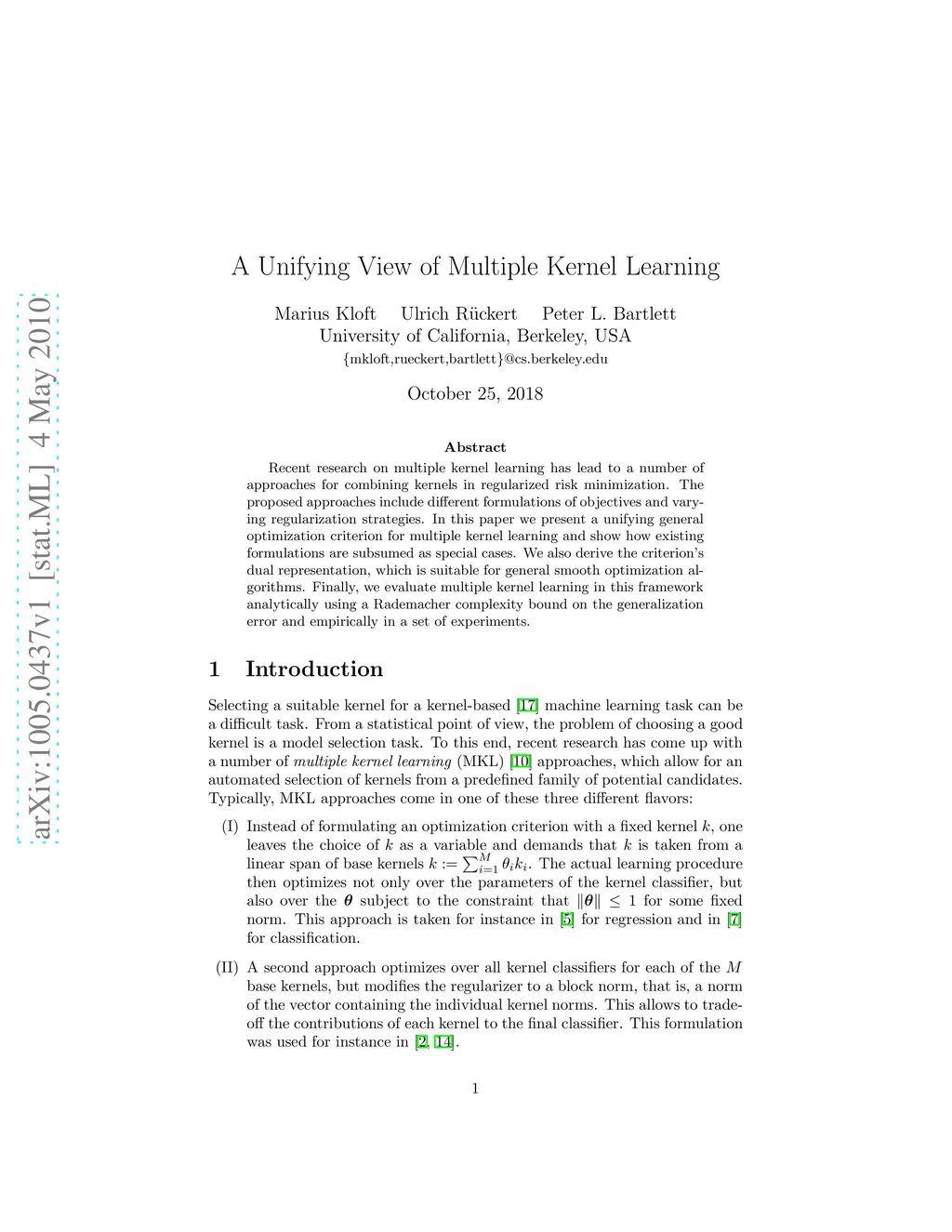 Recent research on multiple kernel learning has lead to a number of approaches for combining kernels in regularized risk minimization. The proposed approaches include different formulations of objectives and varying regularization strategies. In this paper we present a unifying general optimization criterion for multiple kernel learning and show how existing formulations are subsumed as special cases. We also derive the criterion's dual representation, which is suitable for general smooth optimization algorithms. Finally, we evaluate multiple kernel learning in this framework analytically using a Rademacher complexity bound on the generalization error and empirically in a set of experiments.