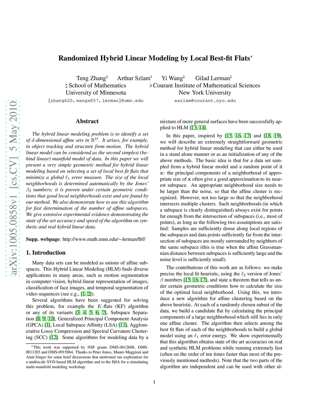 The hybrid linear modeling problem is to identify a set of d-dimensional affine sets in a D-dimensional Euclidean space. It arises, for example, in object tracking and structure from motion. The hybrid linear model can be considered as the second simplest (behind linear) manifold model of data. In this paper we will present a very simple geometric method for hybrid linear modeling based on selecting a set of local best fit flats that minimize a global l1 error measure. The size of the local neighborhoods is determined automatically by the Jones' l2 beta numbers; it is proven under certain geometric conditions that good local neighborhoods exist and are found by our method. We also demonstrate how to use this algorithm for fast determination of the number of affine subspaces. We give extensive experimental evidence demonstrating the state of the art accuracy and speed of the algorithm on synthetic and real hybrid linear data.
