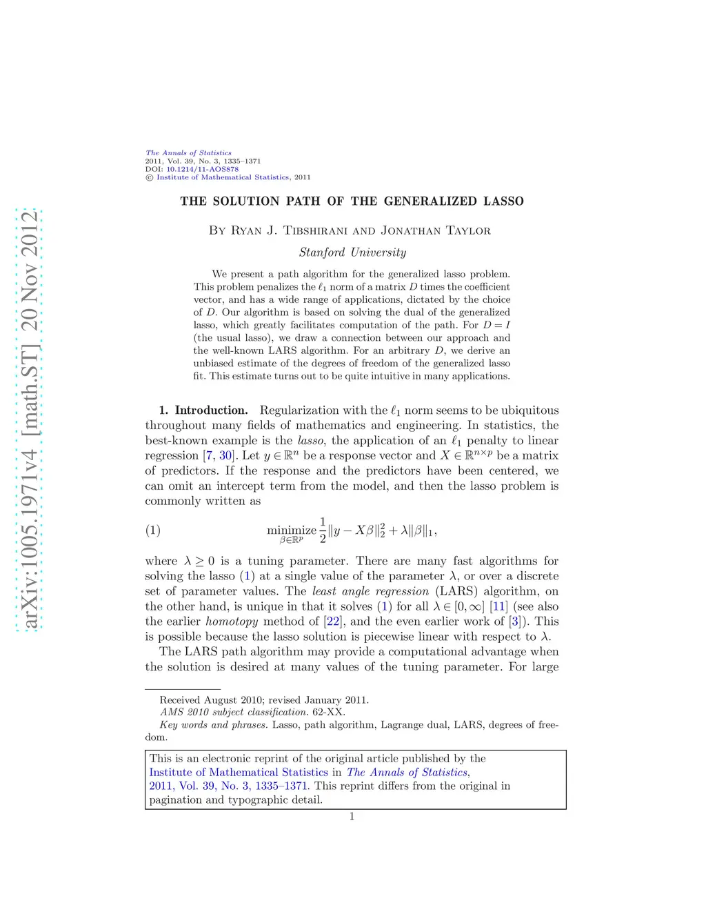 We present a path algorithm for the generalized lasso problem. This problem penalizes the norm of a matrix D times the coefficient vector, and has a wide range of applications, dictated by the choice of D. Our algorithm is based on solving the dual of the generalized lasso, which greatly facilitates computation of the path. For (the usual lasso), we draw a connection between our approach and the well-known LARS algorithm. For an arbitrary D, we derive an unbiased estimate of the degrees of freedom of the generalized lasso fit. This estimate turns out to be quite intuitive in many applications.