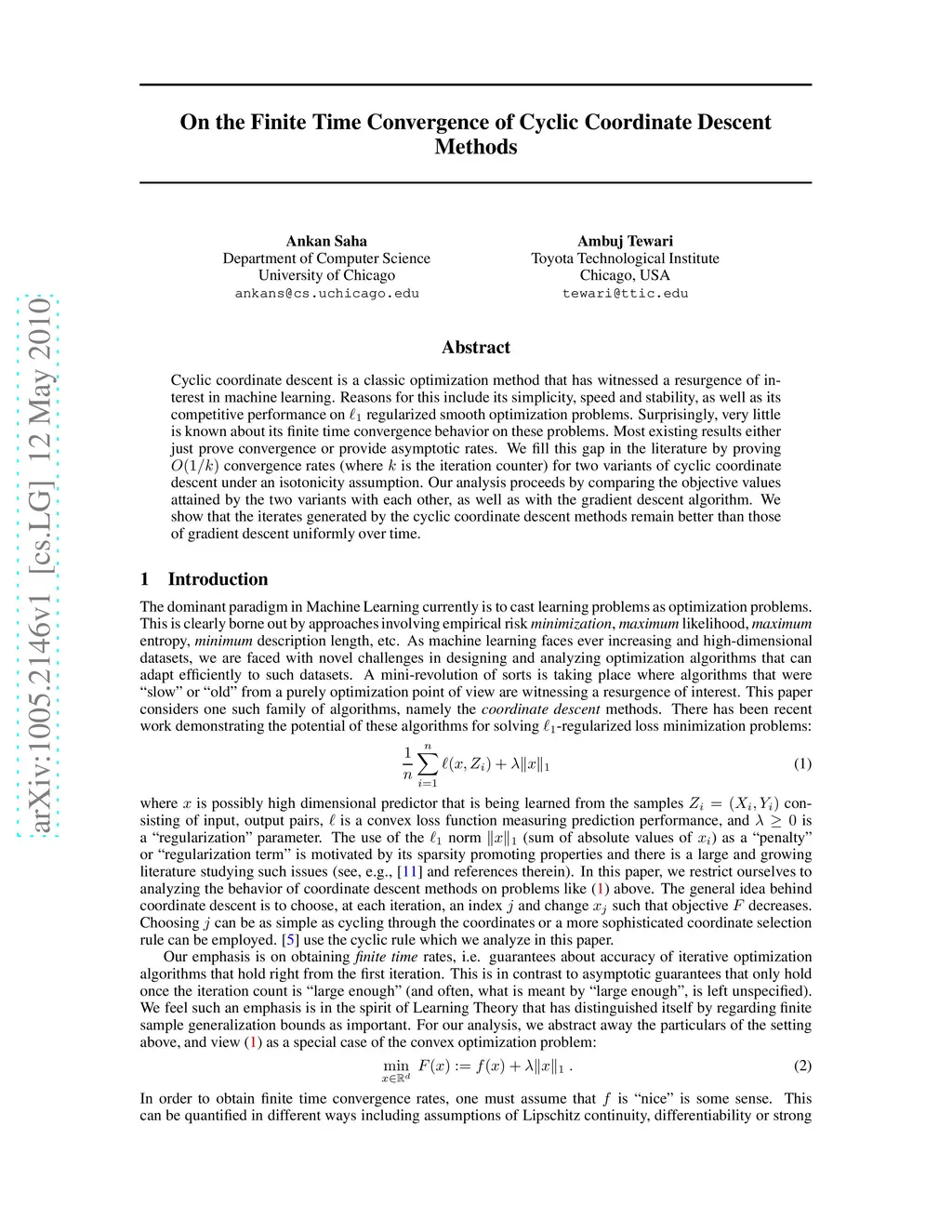 On the Finite Time Convergence of Cyclic Coordinate Descent Methods