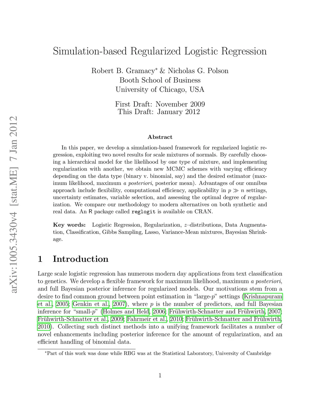 In this paper, we develop a simulation-based framework for regularized logistic regression, exploiting two novel results for scale mixtures of normals. By carefully choosing a hierarchical model for the likelihood by one type of mixture, and implementing regularization with another, we obtain new MCMC schemes with varying efficiency depending on the data type (binary v. binomial, say) and the desired estimator (maximum likelihood, maximum a posteriori, posterior mean). Advantages of our omnibus approach include flexibility, computational efficiency, applicability in p >> n settings, uncertainty estimates, variable selection, and assessing the optimal degree of regularization. We compare our methodology to modern alternatives on both synthetic and real data. An R package called reglogit is available on CRAN.