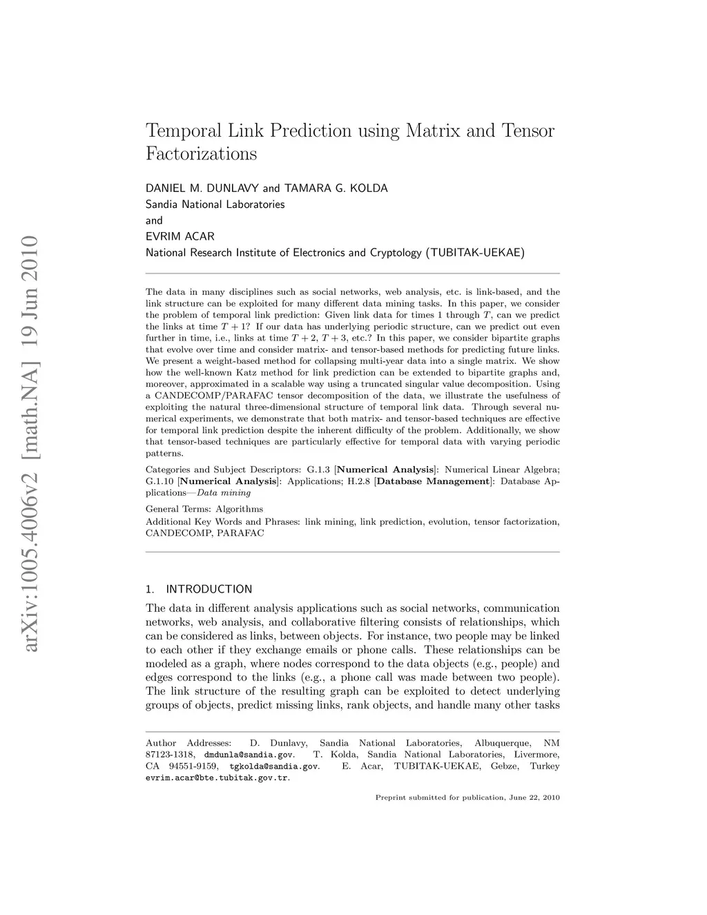 Temporal Link Prediction using Matrix and Tensor Factorizations