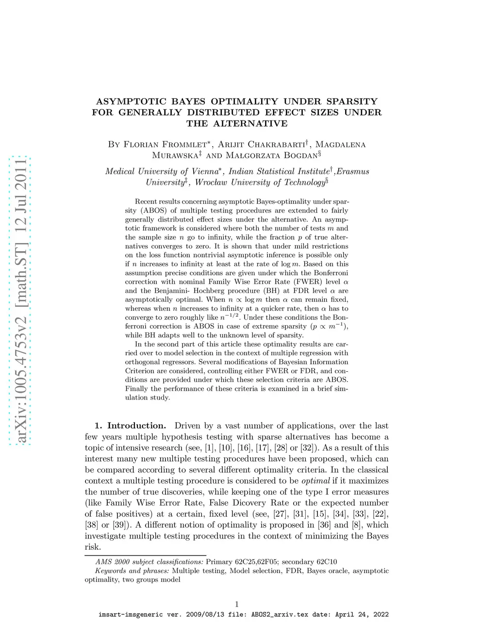 Recent results concerning asymptotic Bayes-optimality under sparsity (ABOS) of multiple testing procedures are extended to fairly generally distributed effect sizes under the alternative. An asymptotic framework is considered where both the number of tests m and the sample size m go to infinity, while the fraction p of true alternatives converges to zero. It is shown that under mild restrictions on the loss function nontrivial asymptotic inference is possible only if n increases to infinity at least at the rate of log m. Based on this assumption precise conditions are given under which the Bonferroni correction with nominal Family Wise Error Rate (FWER) level alpha and the Benjamini- Hochberg procedure (BH) at FDR level alpha are asymptotically optimal. When n is proportional to log m then alpha can remain fixed, whereas when n increases to infinity at a quicker rate, then alpha has to converge to zero roughly like n^(-1/2). Under these conditions the Bonferroni correction is ABOS in case of extreme sparsity, while BH adapts well to the unknown level of sparsity. In the second part of this article these optimality results are carried over to model selection in the context of multiple regression with orthogonal regressors. Several modifications of Bayesian Information Criterion are considered, controlling either FWER or FDR, and conditions are provided under which these selection criteria are ABOS. Finally the performance of these criteria is examined in a brief simulation study.