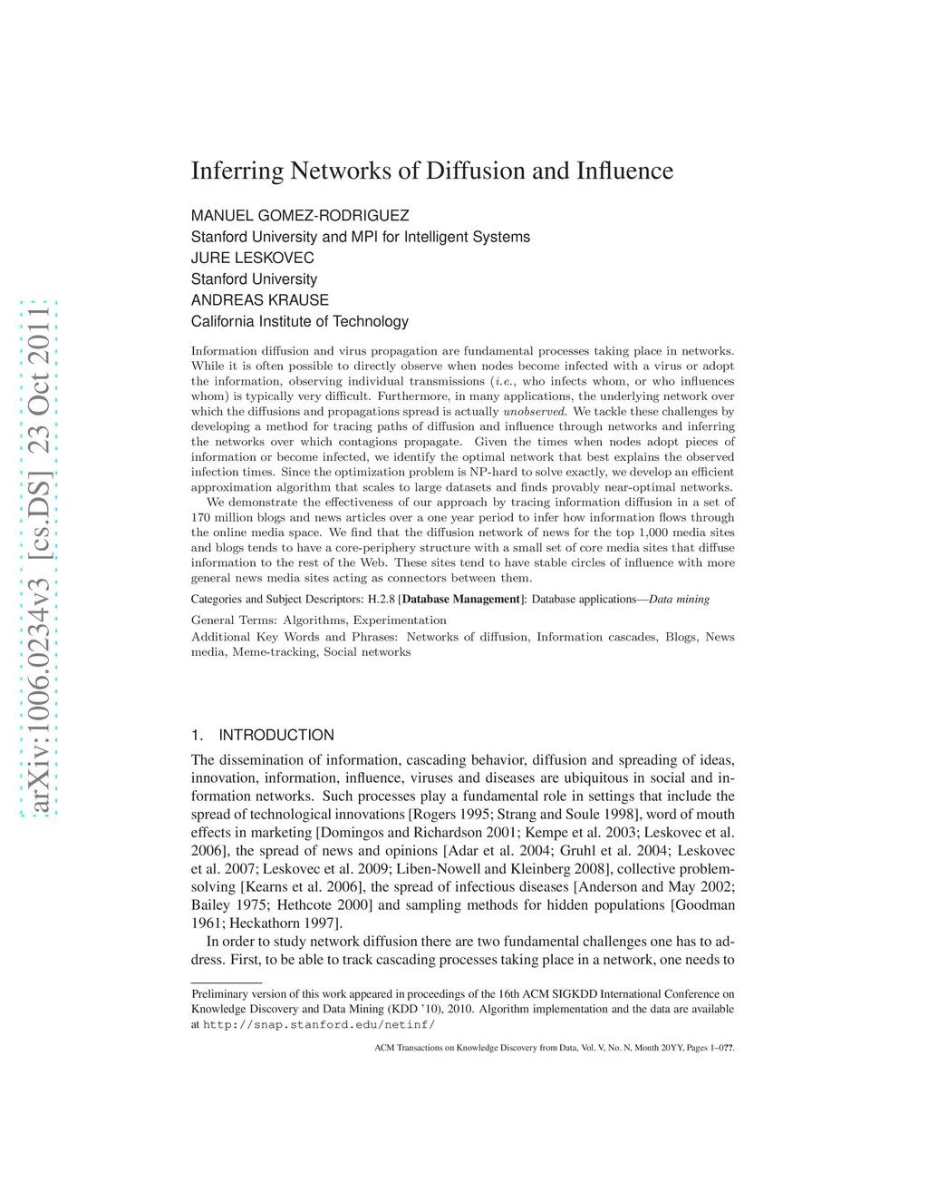 Information diffusion and virus propagation are fundamental processes taking place in networks. While it is often possible to directly observe when nodes become infected with a virus or adopt the information, observing individual transmissions (i.e., who infects whom, or who influences whom) is typically very difficult. Furthermore, in many applications, the underlying network over which the diffusions and propagations spread is actually unobserved. We tackle these challenges by developing a method for tracing paths of diffusion and influence through networks and inferring the networks over which contagions propagate. Given the times when nodes adopt pieces of information or become infected, we identify the optimal network that best explains the observed infection times. Since the optimization problem is NP-hard to solve exactly, we develop an efficient approximation algorithm that scales to large datasets and finds provably near-optimal networks. We demonstrate the effectiveness of our approach by tracing information diffusion in a set of 170 million blogs and news articles over a one year period to infer how information flows through the online media space. We find that the diffusion network of news for the top 1,000 media sites and blogs tends to have a core-periphery structure with a small set of core media sites that diffuse information to the rest of the Web. These sites tend to have stable circles of influence with more general news media sites acting as connectors between them.