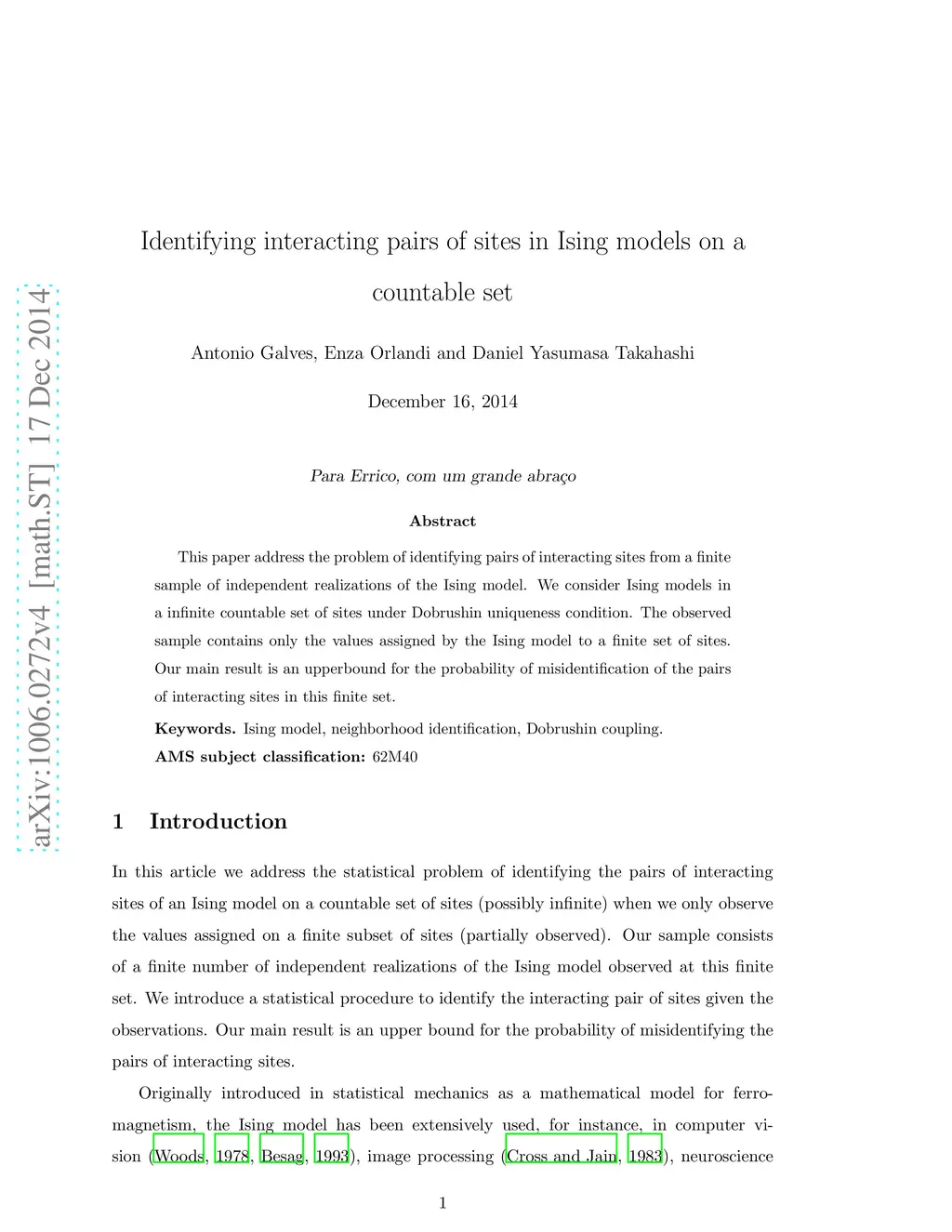 This paper address the problem of identifying pairs of interacting sites from a finite sample of independent realizations of the Ising model. We consider Ising models in a infinite countable set of sites under Dobrushin uniqueness condition. The observed sample contains only the values assigned by the Ising model to a finite set of sites. Our main result is an upperbound for the probability of misidentification of the pairs of interacting sites in this finite set.