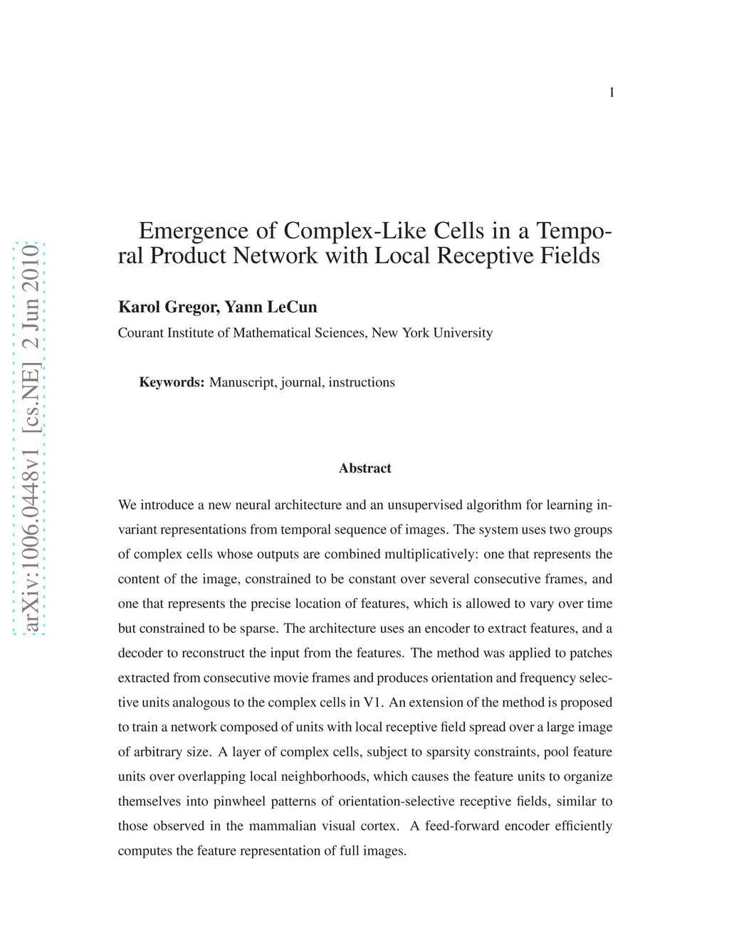 We introduce a new neural architecture and an unsupervised algorithm for learning invariant representations from temporal sequence of images. The system uses two groups of complex cells whose outputs are combined multiplicatively: one that represents the content of the image, constrained to be constant over several consecutive frames, and one that represents the precise location of features, which is allowed to vary over time but constrained to be sparse. The architecture uses an encoder to extract features, and a decoder to reconstruct the input from the features. The method was applied to patches extracted from consecutive movie frames and produces orientation and frequency selective units analogous to the complex cells in V1. An extension of the method is proposed to train a network composed of units with local receptive field spread over a large image of arbitrary size. A layer of complex cells, subject to sparsity constraints, pool feature units over overlapping local neighborhoods, which causes the feature units to organize themselves into pinwheel patterns of orientation-selective receptive fields, similar to those observed in the mammalian visual cortex. A feed-forward encoder efficiently computes the feature representation of full images.