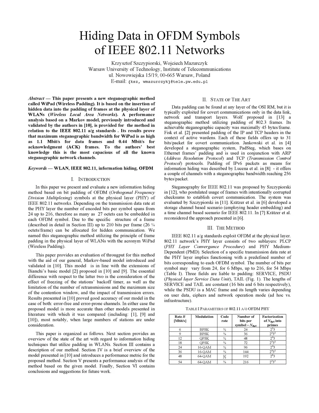 This paper presents a new steganographic method called WiPad (Wireless Padding). It is based on the insertion of hidden data into the padding of frames at the physical layer of WLANs (Wireless Local Area Networks). A performance analysis based on a Markov model, previously introduced and validated by the authors in [10], is provided for the method in relation to the IEEE 802.11 a/g standards. Its results prove that maximum steganographic bandwidth for WiPad is as high as 1.1 Mbit/s for data frames and 0.44 Mbit/s for acknowledgment (ACK) frames. To the authors' best knowledge this is the most capacious of all the known steganographic network channels.