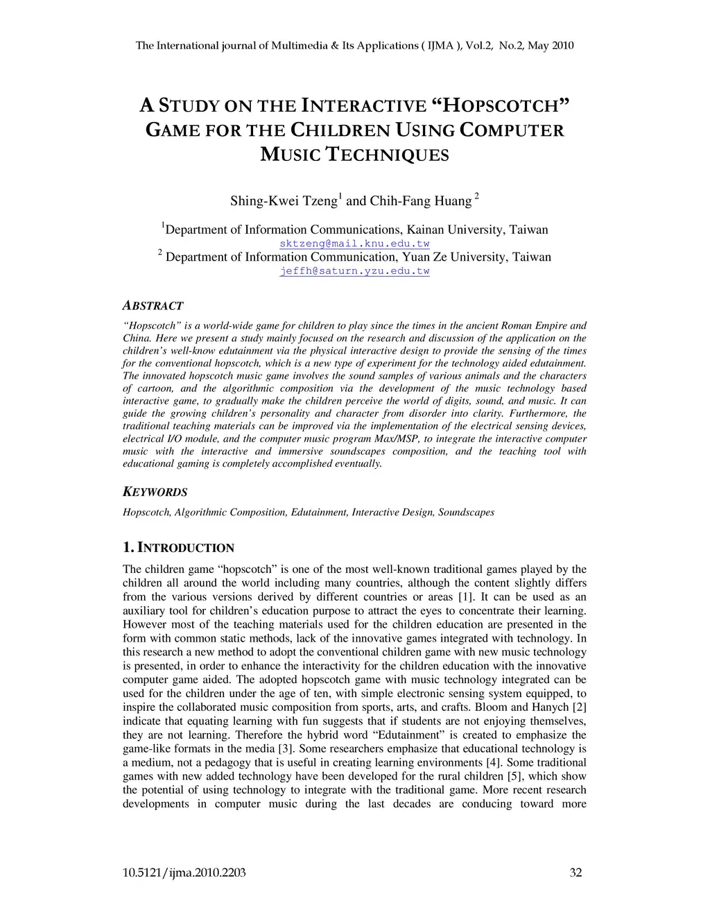 "Hopscotch" is a world-wide game for children to play since the times in the ancient Roman Empire and China. Here we present a study mainly focused on the research and discussion of the application on the children's well-know edutainment via the physical interactive design to provide the sensing of the times for the conventional hopscotch, which is a new type of experiment for the technology aided edutainment. The innovated hopscotch music game involves the sound samples of various animals and the characters of cartoon, and the algorithmic composition via the development of the music technology based interactive game, to gradually make the children perceive the world of digits, sound, and music. It can guide the growing children's personality and character from disorder into clarity. Furthermore, the traditional teaching materials can be improved via the implementation of the electrical sensing devices, electrical I/O module, and the computer music program Max/MSP, to integrate the interactive computer music with the interactive and immersive soundscapes composition, and the teaching tool with educational gaming is completely accomplished eventually.