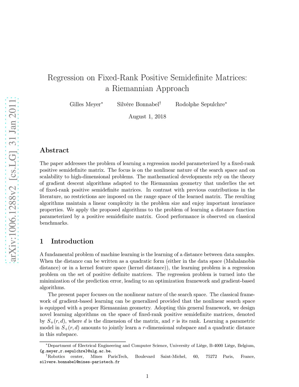 The paper addresses the problem of learning a regression model parameterized by a fixed-rank positive semidefinite matrix. The focus is on the nonlinear nature of the search space and on scalability to high-dimensional problems. The mathematical developments rely on the theory of gradient descent algorithms adapted to the Riemannian geometry that underlies the set of fixed-rank positive semidefinite matrices. In contrast with previous contributions in the literature, no restrictions are imposed on the range space of the learned matrix. The resulting algorithms maintain a linear complexity in the problem size and enjoy important invariance properties. We apply the proposed algorithms to the problem of learning a distance function parameterized by a positive semidefinite matrix. Good performance is observed on classical benchmarks.
