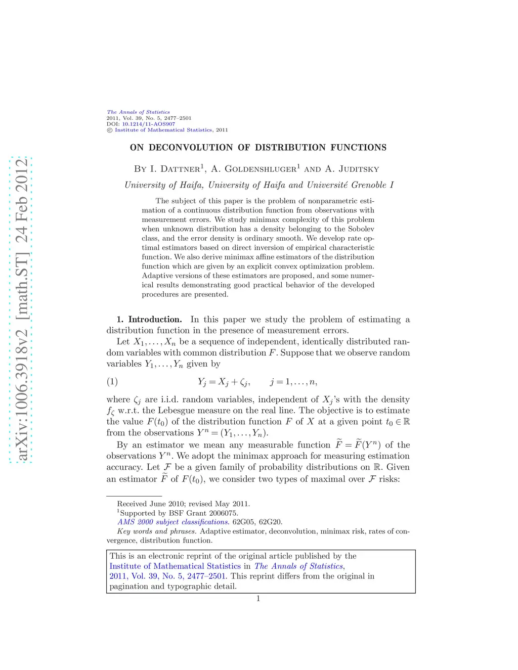 The subject of this paper is the problem of nonparametric estimation of a continuous distribution function from observations with measurement errors. We study minimax complexity of this problem when unknown distribution has a density belonging to the Sobolev class, and the error density is ordinary smooth. We develop rate optimal estimators based on direct inversion of empirical characteristic function. We also derive minimax affine estimators of the distribution function which are given by an explicit convex optimization problem. Adaptive versions of these estimators are proposed, and some numerical results demonstrating good practical behavior of the developed procedures are presented.