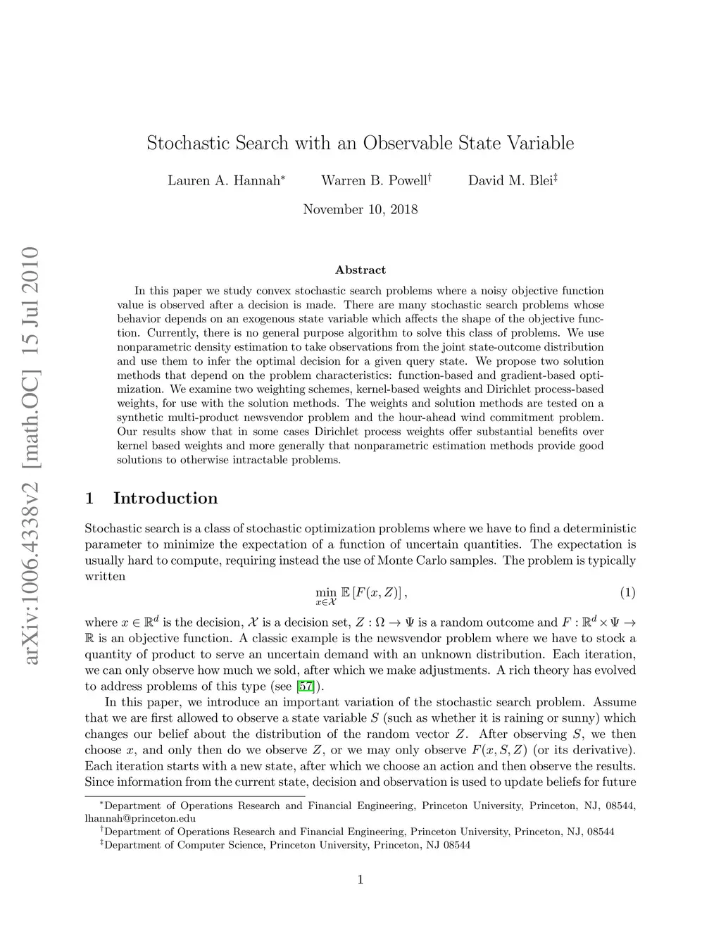 In this paper we study convex stochastic search problems where a noisy objective function value is observed after a decision is made. There are many stochastic search problems whose behavior depends on an exogenous state variable which affects the shape of the objective function. Currently, there is no general purpose algorithm to solve this class of problems. We use nonparametric density estimation to take observations from the joint state-outcome distribution and use them to infer the optimal decision for a given query state. We propose two solution methods that depend on the problem characteristics: function-based and gradient-based optimization. We examine two weighting schemes, kernel-based weights and Dirichlet process-based weights, for use with the solution methods. The weights and solution methods are tested on a synthetic multi-product newsvendor problem and the hour-ahead wind commitment problem. Our results show that in some cases Dirichlet process weights offer substantial benefits over kernel based weights and more generally that nonparametric estimation methods provide good solutions to otherwise intractable problems.