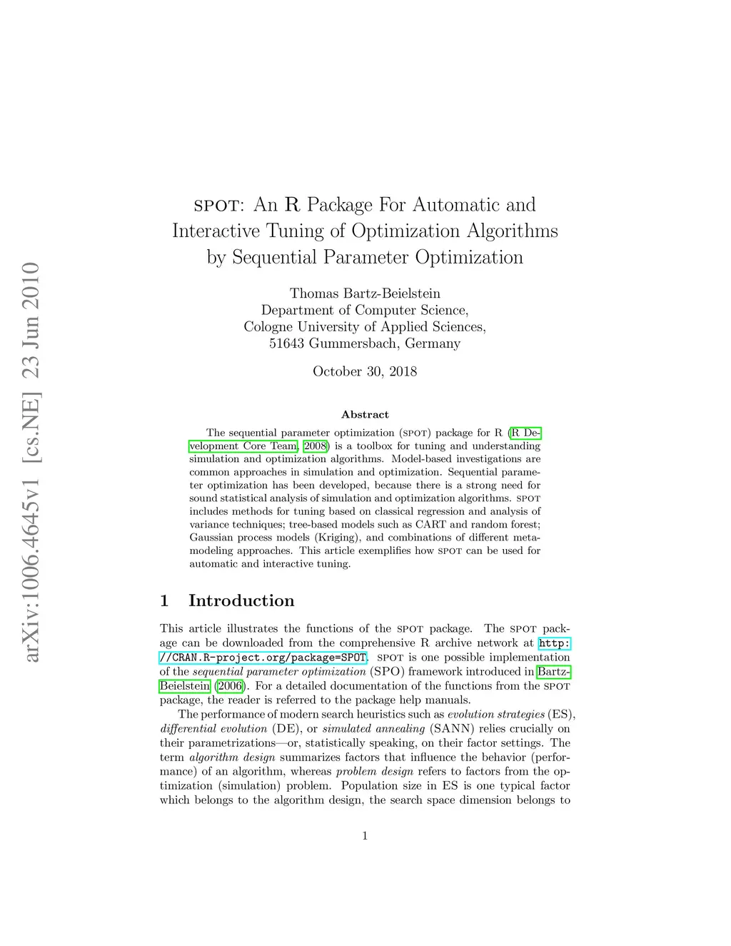 The sequential parameter optimization (SPOT) package for R is a toolbox for tuning and understanding simulation and optimization algorithms. Model-based investigations are common approaches in simulation and optimization. Sequential parameter optimization has been developed, because there is a strong need for sound statistical analysis of simulation and optimization algorithms. SPOT includes methods for tuning based on classical regression and analysis of variance techniques; tree-based models such as CART and random forest; Gaussian process models (Kriging), and combinations of different meta-modeling approaches. This article exemplifies how SPOT can be used for automatic and interactive tuning.