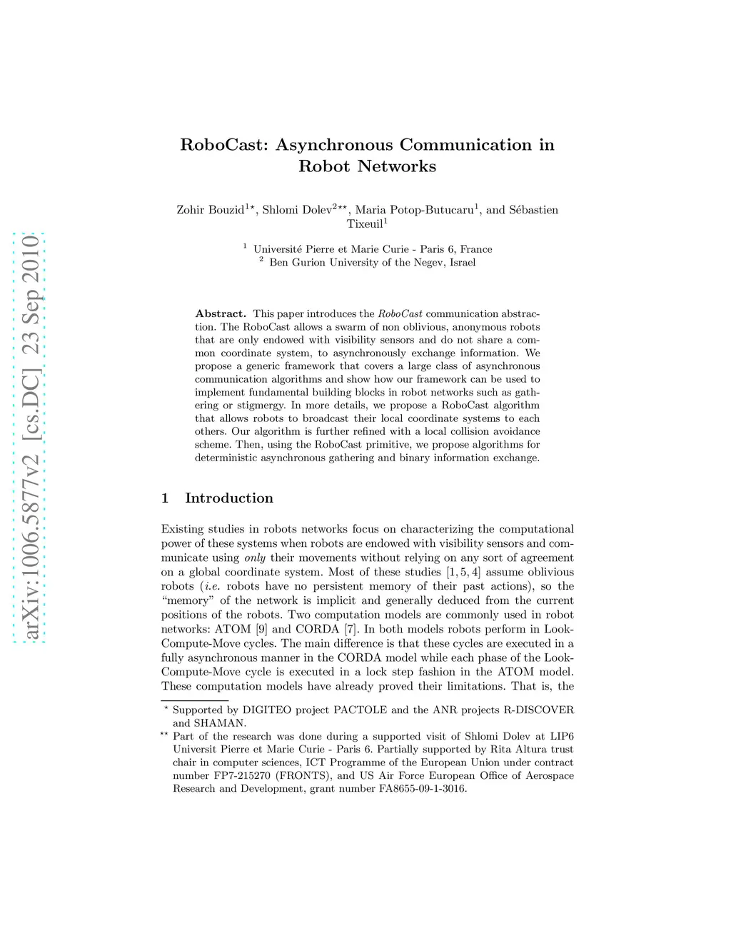 This paper introduces the \emph{RoboCast} communication abstraction. The RoboCast allows a swarm of non oblivious, anonymous robots that are only endowed with visibility sensors and do not share a common coordinate system, to asynchronously exchange information. We propose a generic framework that covers a large class of asynchronous communication algorithms and show how our framework can be used to implement fundamental building blocks in robot networks such as gathering or stigmergy. In more details, we propose a RoboCast algorithm that allows robots to broadcast their local coordinate systems to each others. Our algorithm is further refined with a local collision avoidance scheme. Then, using the RoboCast primitive, we propose algorithms for deterministic asynchronous gathering and binary information exchange.