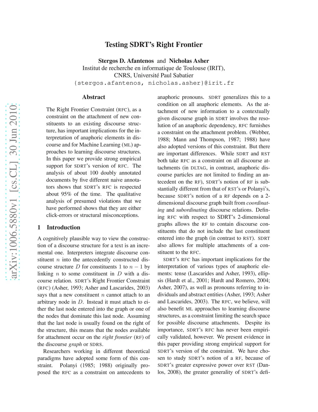 The Right Frontier Constraint (RFC), as a constraint on the attachment of new constituents to an existing discourse structure, has important implications for the interpretation of anaphoric elements in discourse and for Machine Learning (ML) approaches to learning discourse structures. In this paper we provide strong empirical support for SDRT's version of RFC. The analysis of about 100 doubly annotated documents by five different naive annotators shows that SDRT's RFC is respected about 95% of the time. The qualitative analysis of presumed violations that we have performed shows that they are either click-errors or structural misconceptions.
