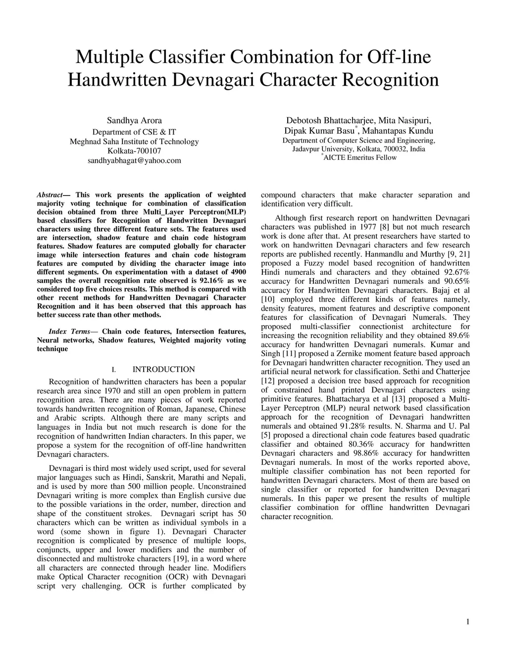 Multiple Classifier Combination for Off-line Handwritten Devnagari