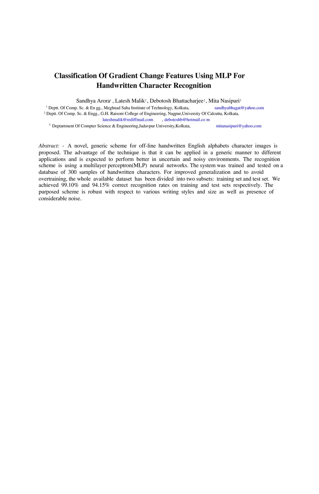Classification Of Gradient Change Features Using MLP For Handwritten
