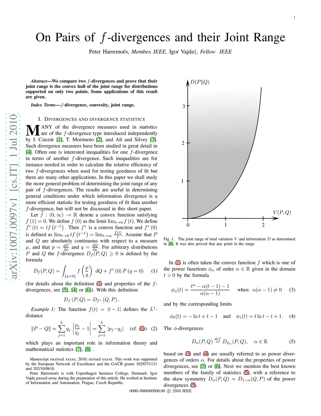 We compare two f-divergences and prove that their joint range is the convex hull of the joint range for distributions supported on only two points. Some applications of this result are given.