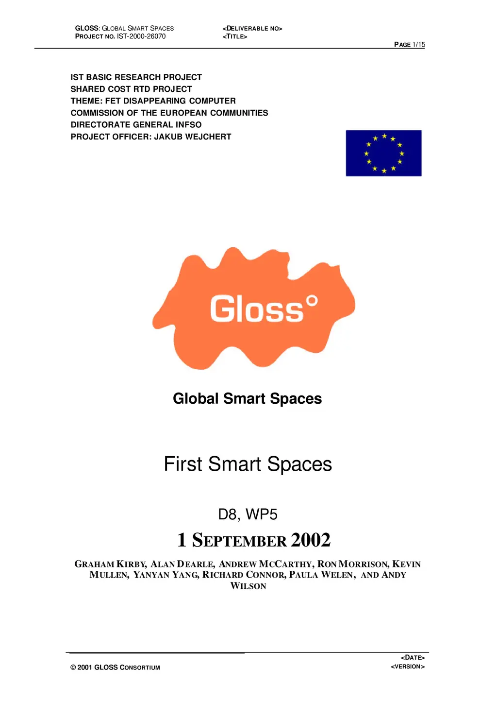 This document describes the Gloss software currently implemented. The description of the Gloss demonstrator for multi-surface interaction can be found in D17. The ongoing integration activity for the work described in D17 and D8 constitutes our development of infrastructure for a first smart space. In this report, the focus is on infrastructure to support the implementation of location aware services. A local architecture provides a framework for constructing Gloss applications, termed assemblies, that run on individual physical nodes. A global architecture defines an overlay network for linking individual assemblies. Both local and global architectures are under active development.