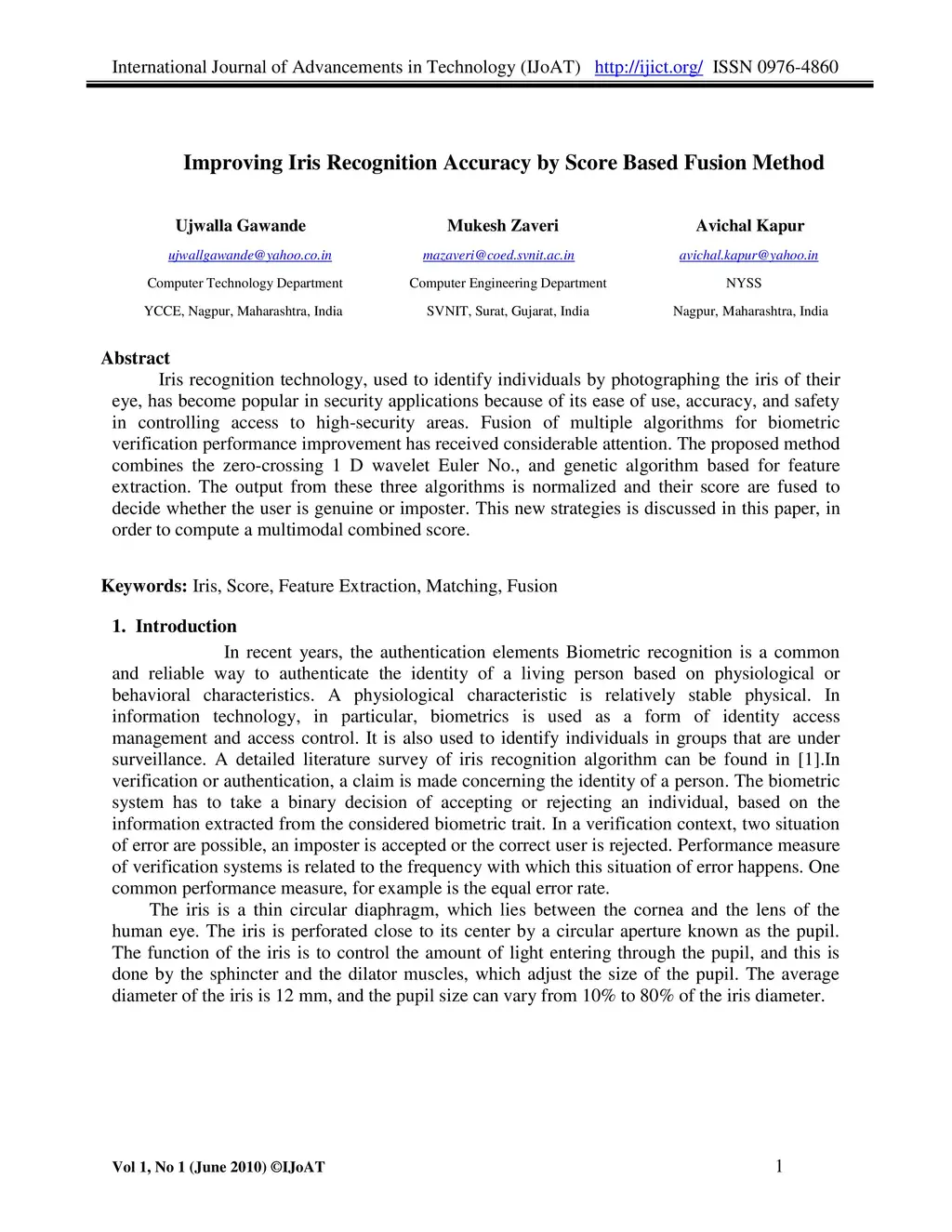Improving Iris Recognition Accuracy By Score Based Fusion Method