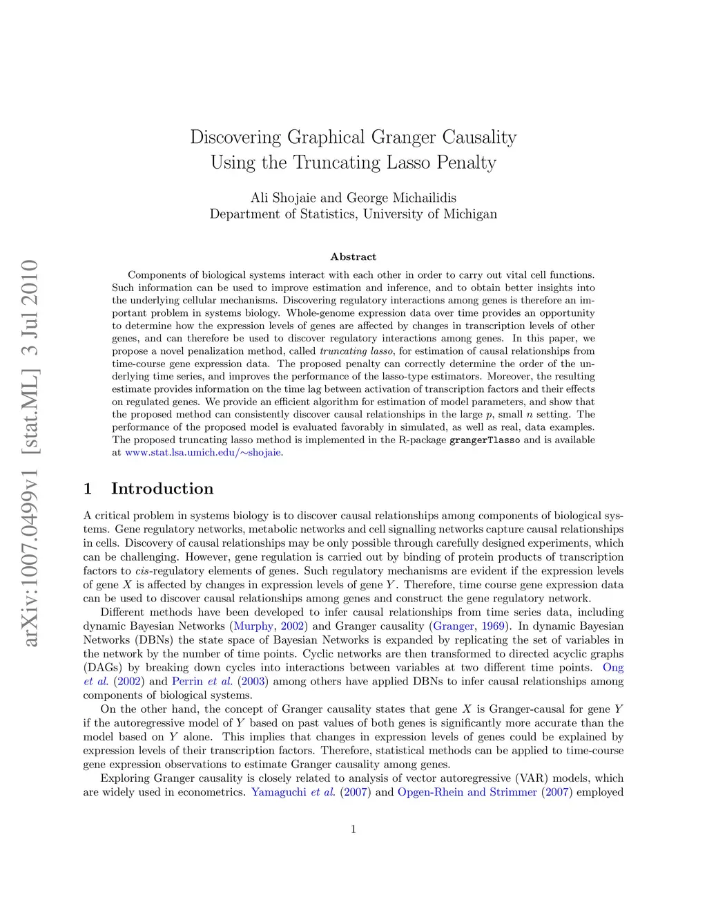 Components of biological systems interact with each other in order to carry out vital cell functions. Such information can be used to improve estimation and inference, and to obtain better insights into the underlying cellular mechanisms. Discovering regulatory interactions among genes is therefore an important problem in systems biology. Whole-genome expression data over time provides an opportunity to determine how the expression levels of genes are affected by changes in transcription levels of other genes, and can therefore be used to discover regulatory interactions among genes. In this paper, we propose a novel penalization method, called truncating lasso, for estimation of causal relationships from time-course gene expression data. The proposed penalty can correctly determine the order of the underlying time series, and improves the performance of the lasso-type estimators. Moreover, the resulting estimate provides information on the time lag between activation of transcription factors and their effects on regulated genes. We provide an efficient algorithm for estimation of model parameters, and show that the proposed method can consistently discover causal relationships in the large , small setting. The performance of the proposed model is evaluated favorably in simulated, as well as real, data examples. The proposed truncating lasso method is implemented in the R-package grangerTlasso and is available at http://www.stat.lsa.umich.edu/~shojaie.