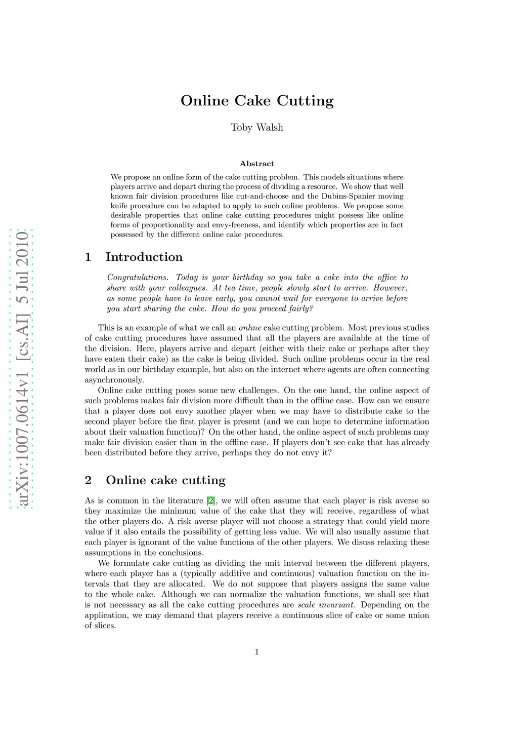 We propose an online form of the cake cutting problem. This models situations where players arrive and depart during the process of dividing a resource. We show that well known fair division procedures like cut-and-choose and the Dubins-Spanier moving knife procedure can be adapted to apply to such online problems. We propose some desirable properties that online cake cutting procedures might possess like online forms of proportionality and envy-freeness, and identify which properties are in fact possessed by the different online cake procedures.