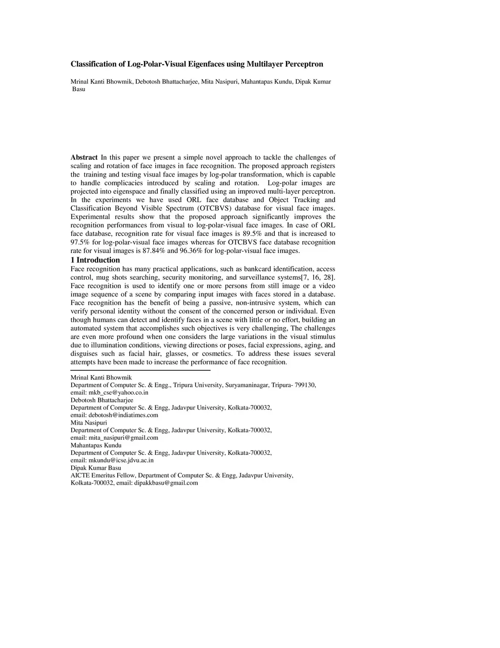 Classification of Log-Polar-Visual Eigenfaces using Multilayer