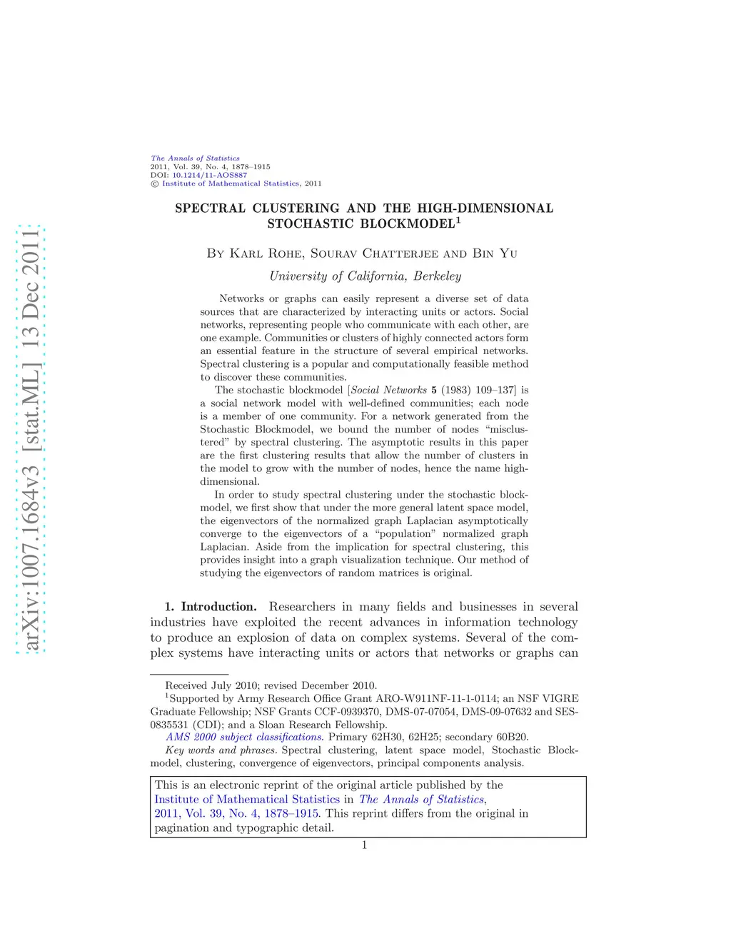 Networks or graphs can easily represent a diverse set of data sources that are characterized by interacting units or actors. Social networks, representing people who communicate with each other, are one example. Communities or clusters of highly connected actors form an essential feature in the structure of several empirical networks. Spectral clustering is a popular and computationally feasible method to discover these communities. The stochastic blockmodel [Social Networks 5 (1983) 109--137] is a social network model with well-defined communities; each node is a member of one community. For a network generated from the Stochastic Blockmodel, we bound the number of nodes "misclustered" by spectral clustering. The asymptotic results in this paper are the first clustering results that allow the number of clusters in the model to grow with the number of nodes, hence the name high-dimensional. In order to study spectral clustering under the stochastic blockmodel, we first show that under the more general latent space model, the eigenvectors of the normalized graph Laplacian asymptotically converge to the eigenvectors of a "population" normalized graph Laplacian. Aside from the implication for spectral clustering, this provides insight into a graph visualization technique. Our method of studying the eigenvectors of random matrices is original.
