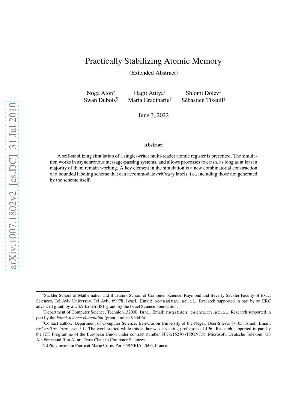 A self-stabilizing simulation of a single-writer multi-reader atomic register is presented. The simulation works in asynchronous message-passing systems, and allows processes to crash, as long as at least a majority of them remain working. A key element in the simulation is a new combinatorial construction of a bounded labeling scheme that can accommodate arbitrary labels, i.e., including those not generated by the scheme itself.