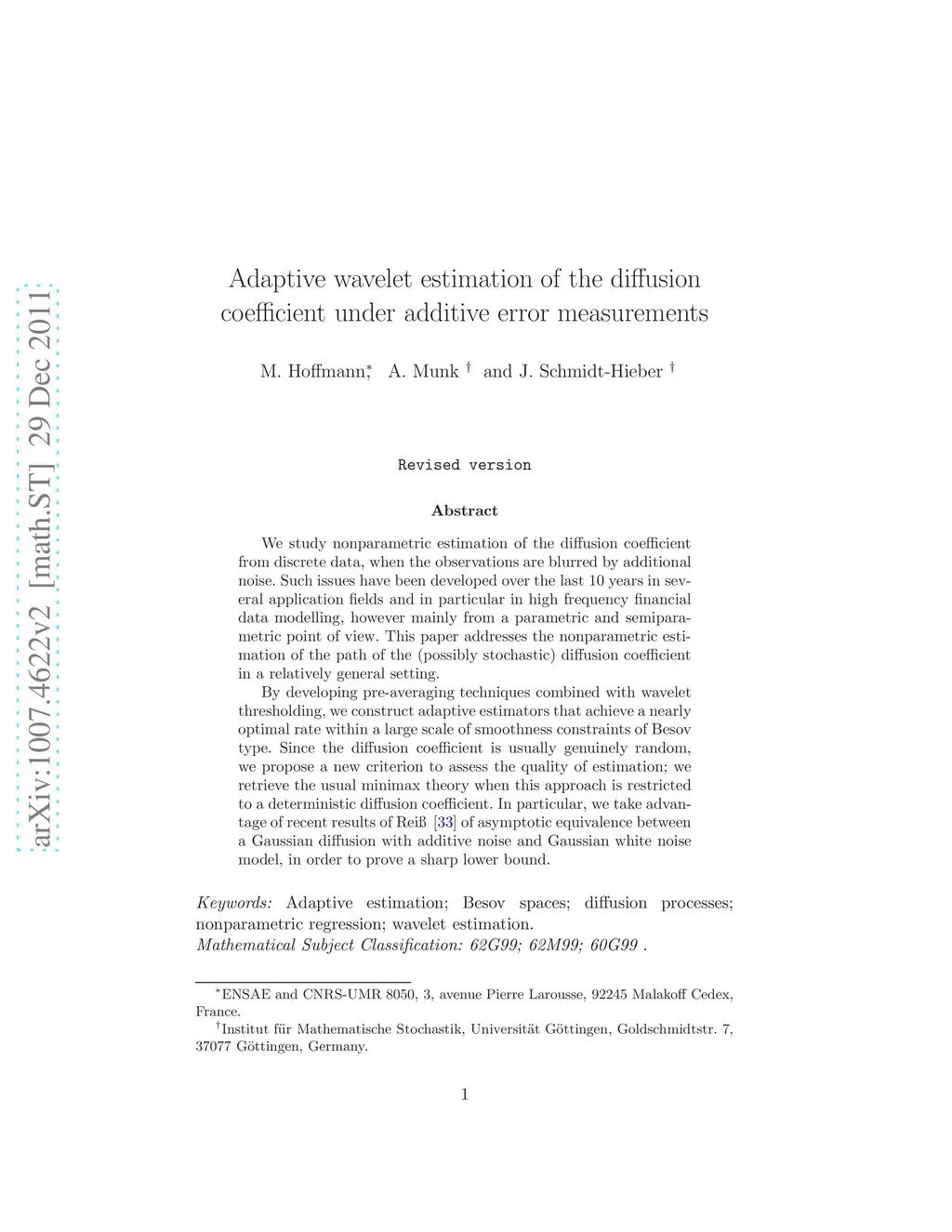Adaptive wavelet estimation of the diffusion coefficient under additive