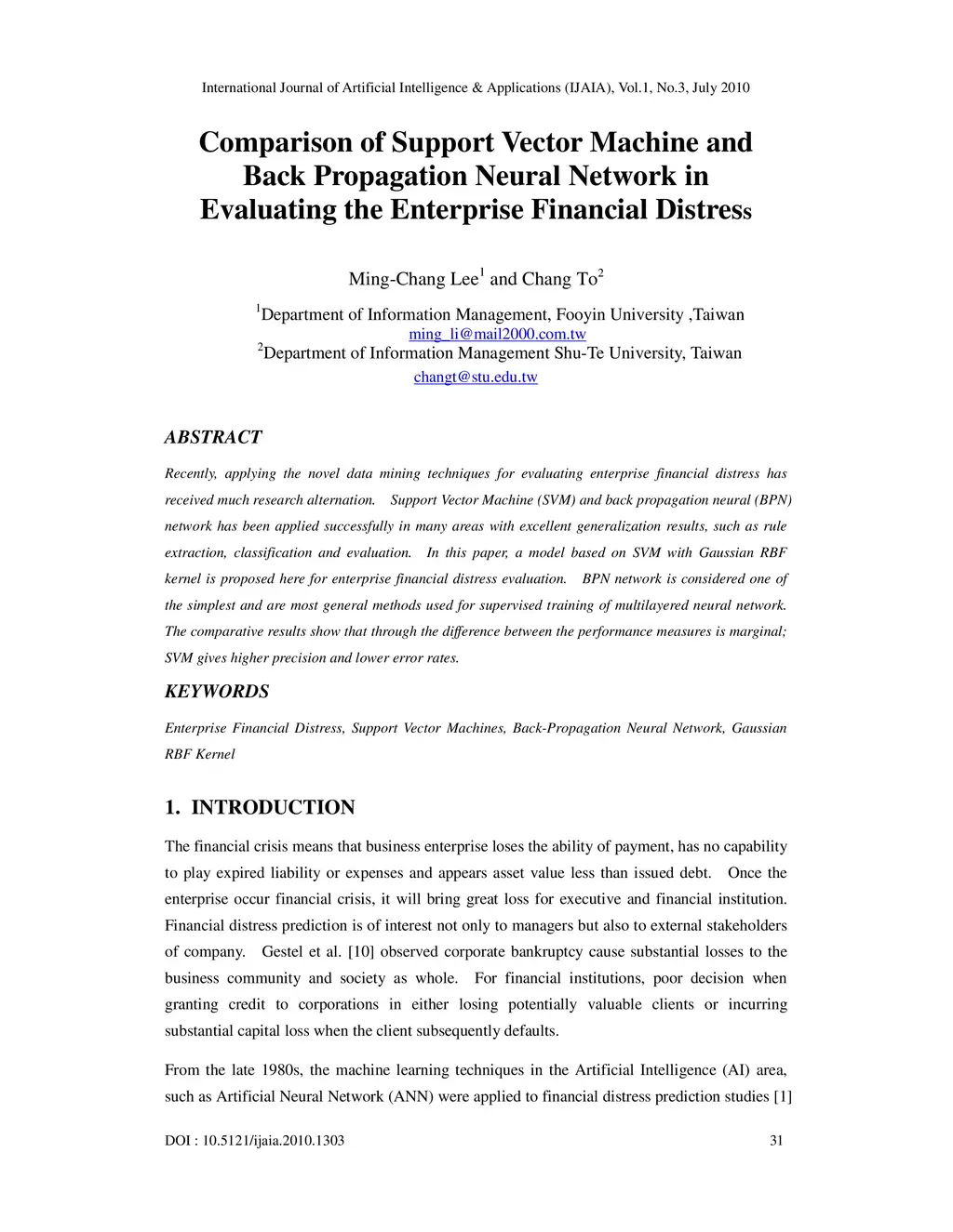 Recently, applying the novel data mining techniques for evaluating enterprise financial distress has received much research alternation. Support Vector Machine (SVM) and back propagation neural (BPN) network has been applied successfully in many areas with excellent generalization results, such as rule extraction, classification and evaluation. In this paper, a model based on SVM with Gaussian RBF kernel is proposed here for enterprise financial distress evaluation. BPN network is considered one of the simplest and are most general methods used for supervised training of multilayered neural network. The comparative results show that through the difference between the performance measures is marginal; SVM gives higher precision and lower error rates.