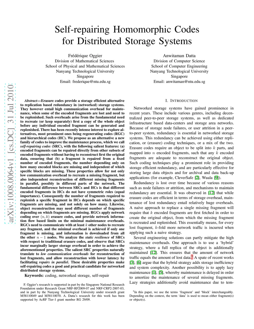 Self-repairing Homomorphic Codes for Distributed Storage Systems