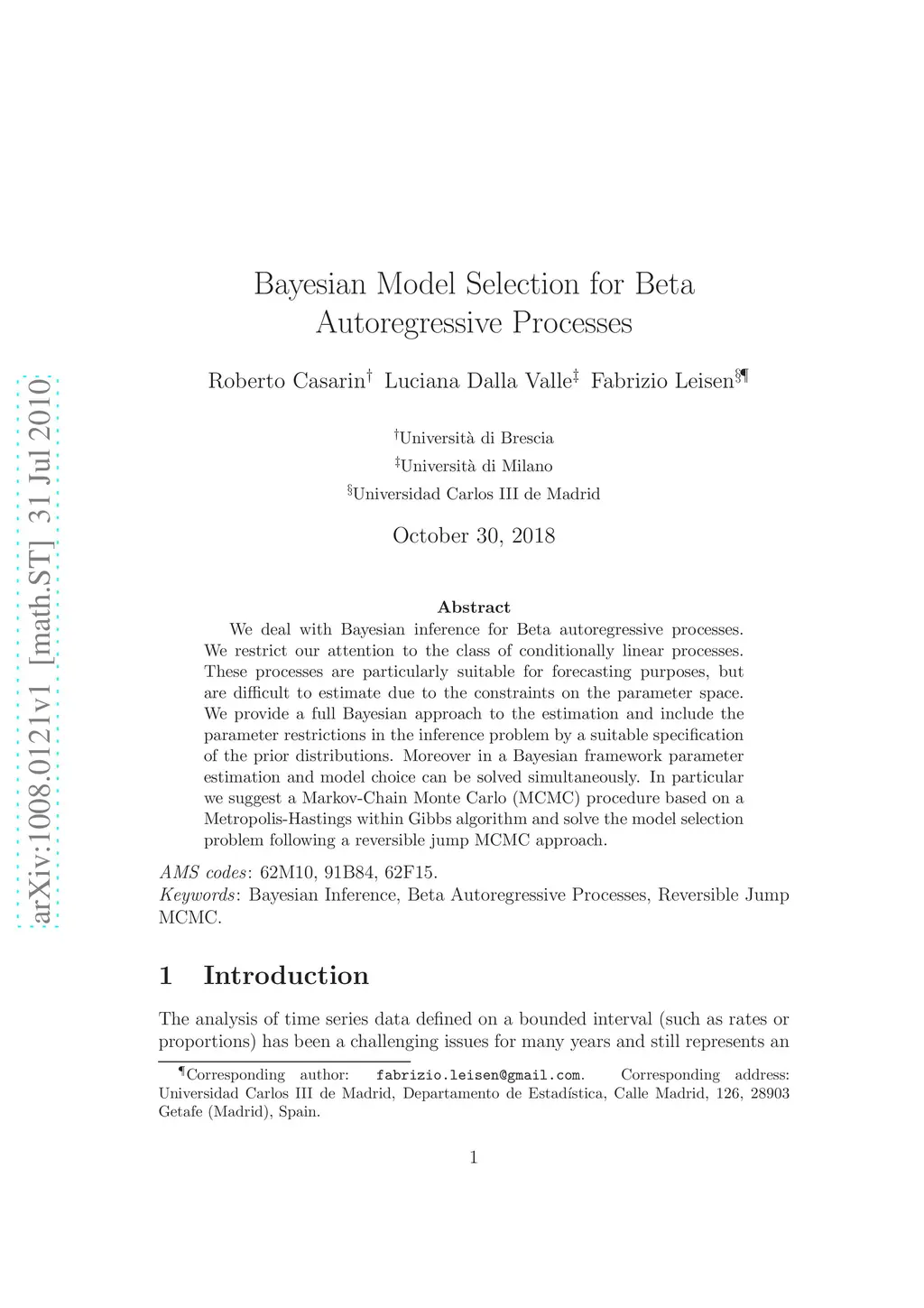 We deal with Bayesian inference for Beta autoregressive processes. We restrict our attention to the class of conditionally linear processes. These processes are particularly suitable for forecasting purposes, but are difficult to estimate due to the constraints on the parameter space. We provide a full Bayesian approach to the estimation and include the parameter restrictions in the inference problem by a suitable specification of the prior distributions. Moreover in a Bayesian framework parameter estimation and model choice can be solved simultaneously. In particular we suggest a Markov-Chain Monte Carlo (MCMC) procedure based on a Metropolis-Hastings within Gibbs algorithm and solve the model selection problem following a reversible jump MCMC approach.