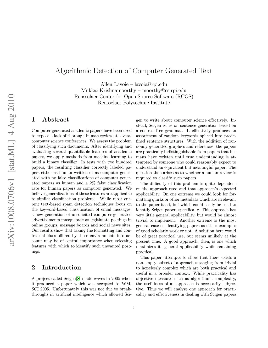 Computer generated academic papers have been used to expose a lack of thorough human review at several computer science conferences. We assess the problem of classifying such documents. After identifying and evaluating several quantifiable features of academic papers, we apply methods from machine learning to build a binary classifier. In tests with two hundred papers, the resulting classifier correctly labeled papers either as human written or as computer generated with no false classifications of computer generated papers as human and a 2% false classification rate for human papers as computer generated. We believe generalizations of these features are applicable to similar classification problems. While most current text-based spam detection techniques focus on the keyword-based classification of email messages, a new generation of unsolicited computer-generated advertisements masquerade as legitimate postings in online groups, message boards and social news sites. Our results show that taking the formatting and contextual clues offered by these environments into account may be of central importance when selecting features with which to identify such unwanted postings.