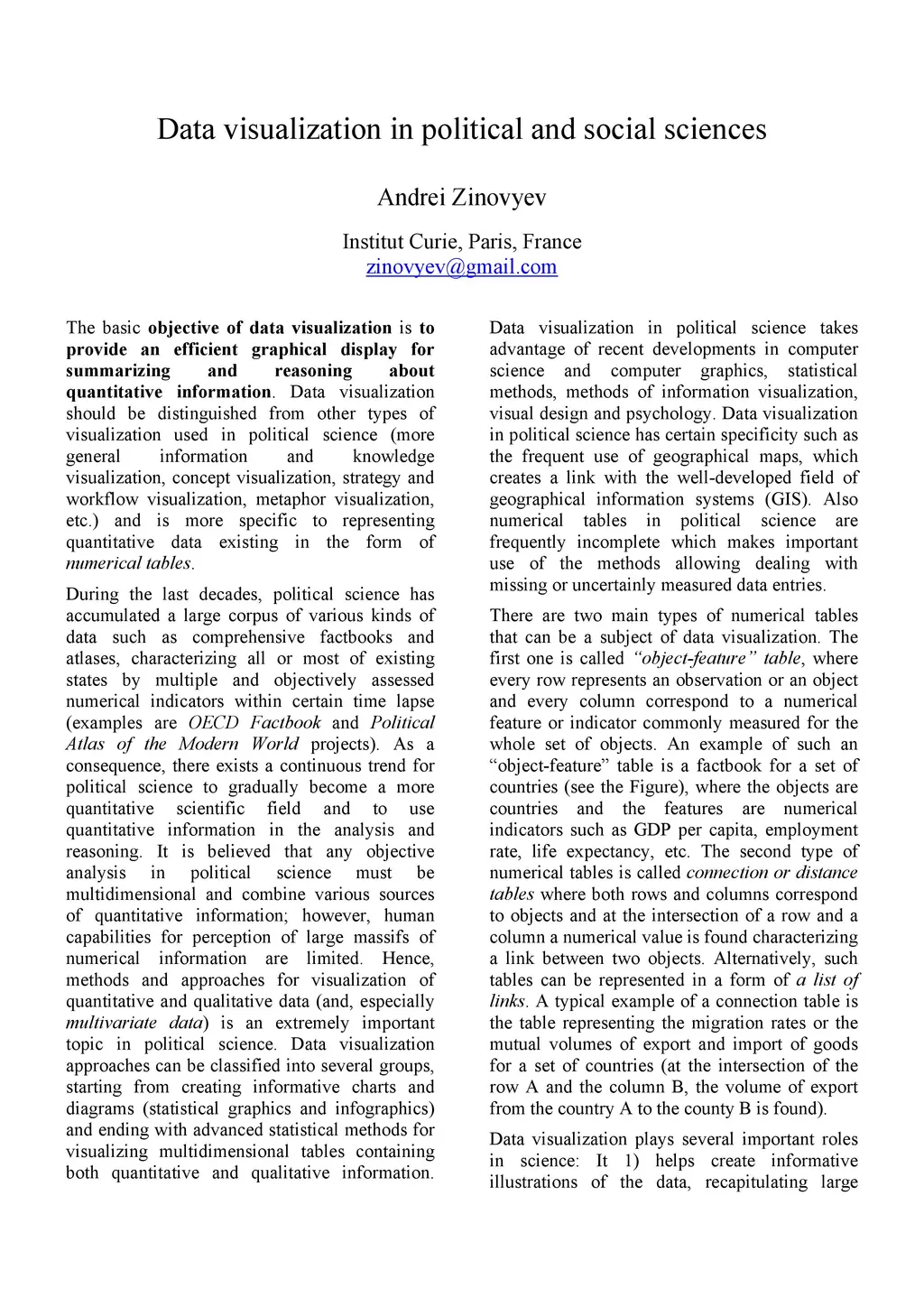 The basic objective of data visualization is to provide an efficient graphical display for summarizing and reasoning about quantitative information. During the last decades, political science has accumulated a large corpus of various kinds of data such as comprehensive factbooks and atlases, characterizing all or most of existing states by multiple and objectively assessed numerical indicators within certain time lapse. As a consequence, there exists a continuous trend for political science to gradually become a more quantitative scientific field and to use quantitative information in the analysis and reasoning. It is believed that any objective analysis in political science must be multidimensional and combine various sources of quantitative information; however, human capabilities for perception of large massifs of numerical information are limited. Hence, methods and approaches for visualization of quantitative and qualitative data (and, especially multivariate data) is an extremely important topic. Data visualization approaches can be classified into several groups, starting from creating informative charts and diagrams (statistical graphics and infographics) and ending with advanced statistical methods for visualizing multidimensional tables containing both quantitative and qualitative information. In this article we provide a short review of existing methods of data visualization methods with applications in political and social science.