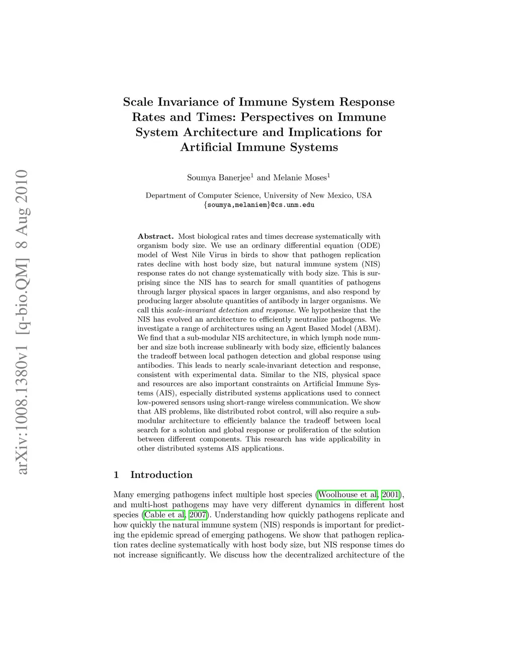 Most biological rates and times decrease systematically with organism body size. We use an ordinary differential equation (ODE) model of West Nile Virus in birds to show that pathogen replication rates decline with host body size, but natural immune system (NIS) response rates do not change systematically with body size. This is surprising since the NIS has to search for small quantities of pathogens through larger physical spaces in larger organisms, and also respond by producing larger absolute quantities of antibody in larger organisms. We call this scale-invariant detection and response. We hypothesize that the NIS has evolved an architecture to efficiently neutralize pathogens. We investigate a range of architectures using an Agent Based Model (ABM). We find that a sub-modular NIS architecture, in which lymph node number and size both increase sublinearly with body size, efficiently balances the tradeoff between local pathogen detection and global response using antibodies. This leads to nearly scale-invariant detection and response, consistent with experimental data. Similar to the NIS, physical space and resources are also important constraints on Artificial Immune Systems (AIS), especially distributed systems applications used to connect low-powered sensors using short-range wireless communication. We show that AIS problems, like distributed robot control, will also require a sub-modular architecture to efficiently balance the tradeoff between local search for a solution and global response or proliferation of the solution between different components. This research has wide applicability in other distributed systems AIS applications.
