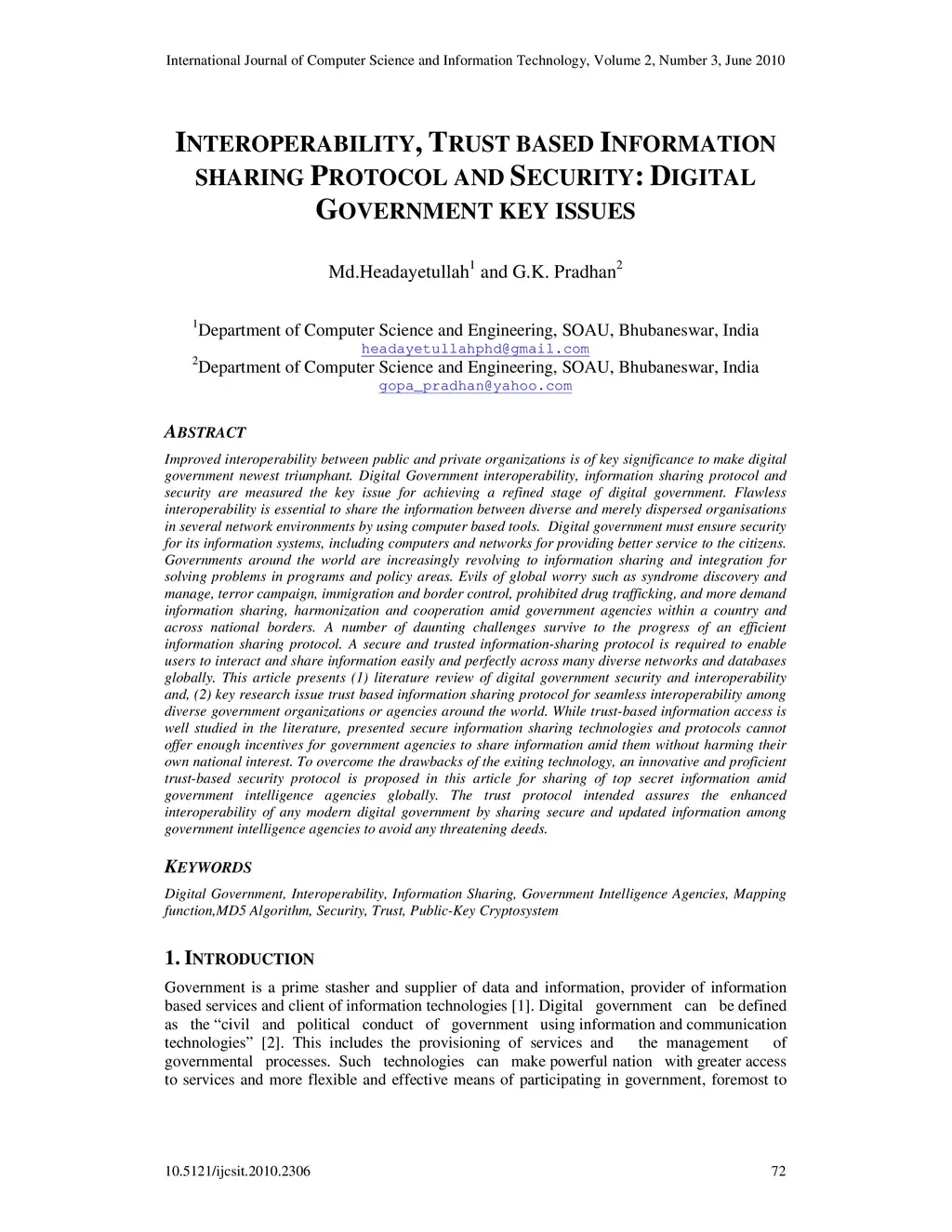 Improved interoperability between public and private organizations is of key significance to make digital government newest triumphant. Digital Government interoperability, information sharing protocol and security are measured the key issue for achieving a refined stage of digital government. Flawless interoperability is essential to share the information between diverse and merely dispersed organisations in several network environments by using computer based tools. Digital government must ensure security for its information systems, including computers and networks for providing better service to the citizens. Governments around the world are increasingly revolving to information sharing and integration for solving problems in programs and policy areas. Evils of global worry such as syndrome discovery and manage, terror campaign, immigration and border control, prohibited drug trafficking, and more demand information sharing, harmonization and cooperation amid government agencies within a country and across national borders. A number of daunting challenges survive to the progress of an efficient information sharing protocol. A secure and trusted information-sharing protocol is required to enable users to interact and share information easily and perfectly across many diverse networks and databases globally.