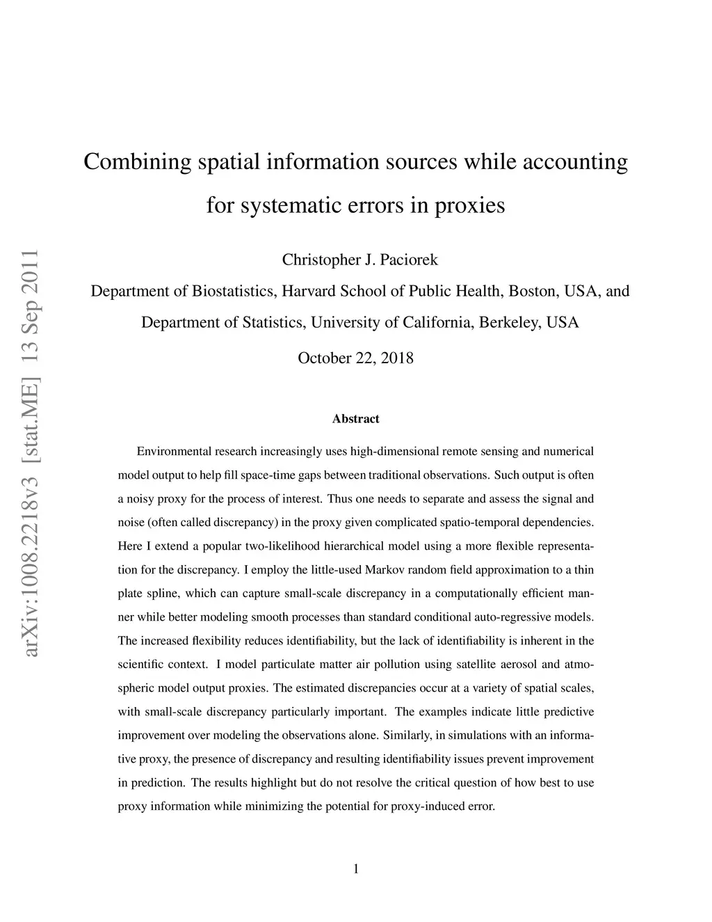 Environmental research increasingly uses high-dimensional remote sensing and numerical model output to help fill space-time gaps between traditional observations. Such output is often a noisy proxy for the process of interest. Thus one needs to separate and assess the signal and noise (often called discrepancy) in the proxy given complicated spatio-temporal dependencies. Here I extend a popular two-likelihood hierarchical model using a more flexible representation for the discrepancy. I employ the little-used Markov random field approximation to a thin plate spline, which can capture small-scale discrepancy in a computationally efficient manner while better modeling smooth processes than standard conditional auto-regressive models. The increased flexibility reduces identifiability, but the lack of identifiability is inherent in the scientific context. I model particulate matter air pollution using satellite aerosol and atmospheric model output proxies. The estimated discrepancies occur at a variety of spatial scales, with small-scale discrepancy particularly important. The examples indicate little predictive improvement over modeling the observations alone. Similarly, in simulations with an informative proxy, the presence of discrepancy and resulting identifiability issues prevent improvement in prediction. The results highlight but do not resolve the critical question of how best to use proxy information while minimizing the potential for proxy-induced error.