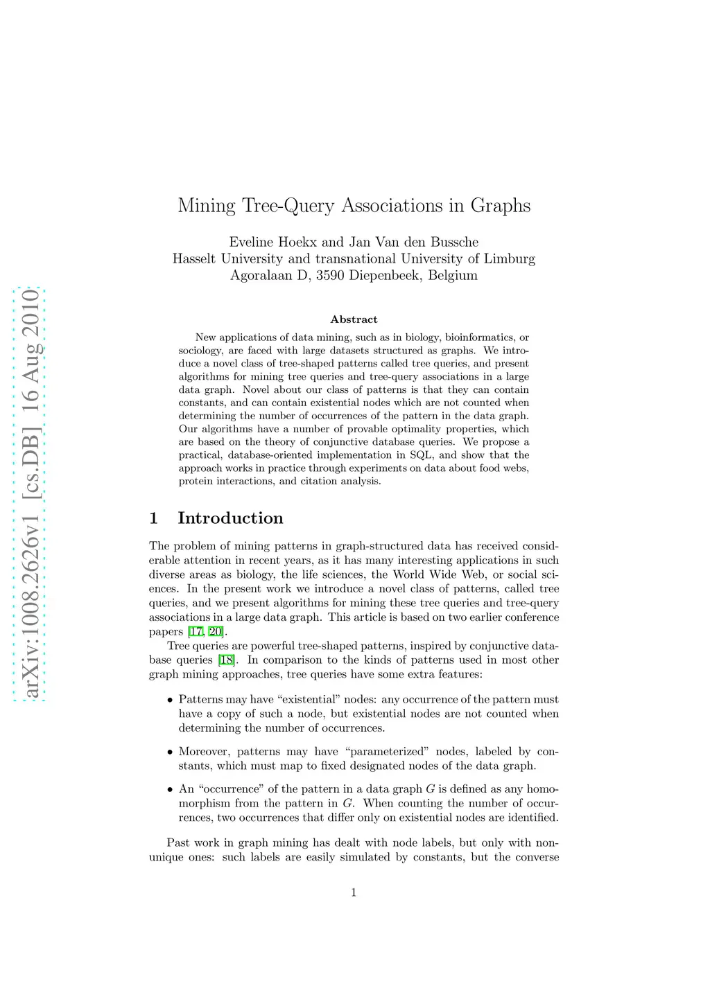 New applications of data mining, such as in biology, bioinformatics, or sociology, are faced with large datasetsstructured as graphs. We introduce a novel class of tree-shapedpatterns called tree queries, and present algorithms for miningtree queries and tree-query associations in a large data graph. Novel about our class of patterns is that they can containconstants, and can contain existential nodes which are not counted when determining the number of occurrences of the patternin the data graph. Our algorithms have a number of provableoptimality properties, which are based on the theory of conjunctive database queries. We propose a practical, database-oriented implementation in SQL, and show that the approach works in practice through experiments on data about food webs, protein interactions, and citation analysis.