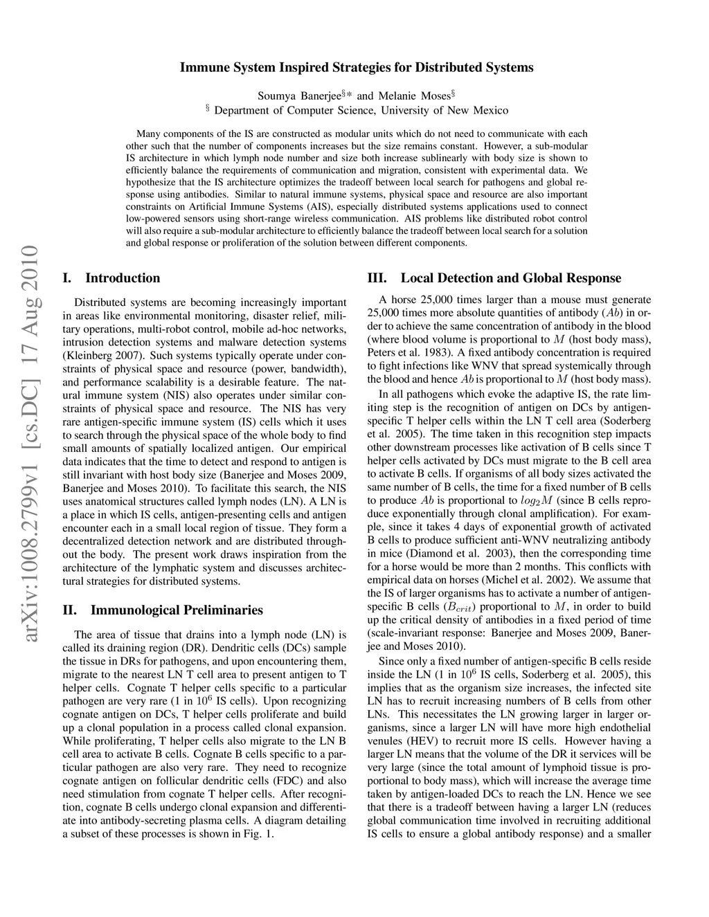 Many components of the IS are constructed as modular units which do not need to communicate with each other such that the number of components increases but the size remains constant. However, a sub-modular IS architecture in which lymph node number and size both increase sublinearly with body size is shown to efficiently balance the requirements of communication and migration, consistent with experimental data. We hypothesize that the IS architecture optimizes the tradeoff between local search for pathogens and global response using antibodies. Similar to natural immune systems, physical space and resource are also important constraints on Artificial Immune Systems (AIS), especially distributed systems applications used to connect low-powered sensors using short-range wireless communication. AIS problems like distributed robot control will also require a sub-modular architecture to efficiently balance the tradeoff between local search for a solution and global response or proliferation of the solution between different components.