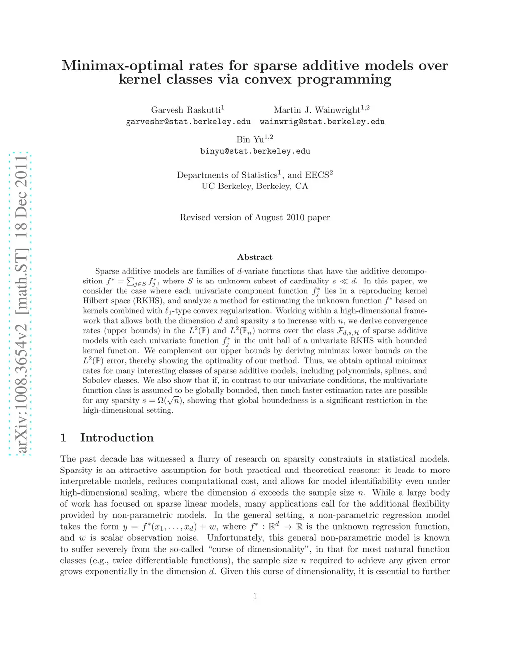 Sparse additive models are families of -variate functions that have the additive decomposition , where is an unknown subset of cardinality . In this paper, we consider the case where each univariate component function lies in a reproducing kernel Hilbert space (RKHS), and analyze a method for estimating the unknown function based on kernels combined with -type convex regularization. Working within a high-dimensional framework that allows both the dimension and sparsity to increase with , we derive convergence rates (upper bounds) in the and norms over the class of sparse additive models with each univariate function in the unit ball of a univariate RKHS with bounded kernel function. We complement our upper bounds by deriving minimax lower bounds on the error, thereby showing the optimality of our method. Thus, we obtain optimal minimax rates for many interesting classes of sparse additive models, including polynomials, splines, and Sobolev classes. We also show that if, in contrast to our univariate conditions, the multivariate function class is assumed to be globally bounded, then much faster estimation rates are possible for any sparsity , showing that global boundedness is a significant restriction in the high-dimensional setting.