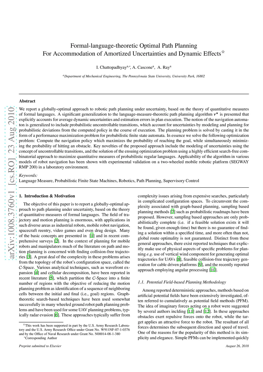 We report a globally-optimal approach to robotic path planning under uncertainty, based on the theory of quantitative measures of formal languages. A significant generalization to the language-measure-theoretic path planning algorithm is presented that explicitly accounts for average dynamic uncertainties and estimation errors in plan execution. The notion of the navigation automaton is generalized to include probabilistic uncontrollable transitions, which account for uncertainties by modeling and planning for probabilistic deviations from the computed policy in the course of execution. The planning problem is solved by casting it in the form of a performance maximization problem for probabilistic finite state automata. In essence we solve the following optimization problem: Compute the navigation policy which maximizes the probability of reaching the goal, while simultaneously minimizing the probability of hitting an obstacle. Key novelties of the proposed approach include the modeling of uncertainties using the concept of uncontrollable transitions, and the solution of the ensuing optimization problem using a highly efficient search-free combinatorial approach to maximize quantitative measures of probabilistic regular languages. Applicability of the algorithm in various models of robot navigation has been shown with experimental validation on a two-wheeled mobile robotic platform (SEGWAY RMP 200) in a laboratory environment.