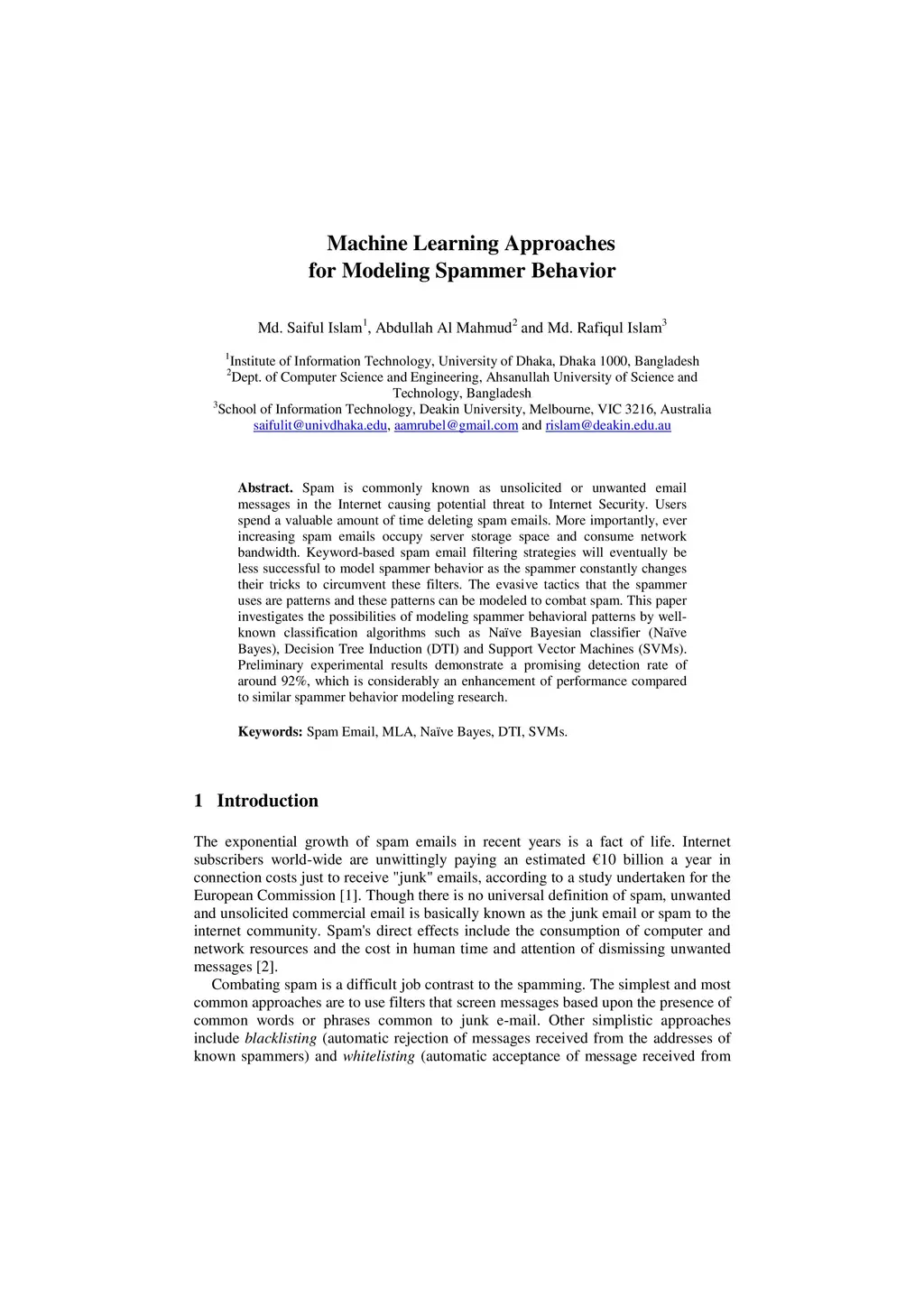 Spam is commonly known as unsolicited or unwanted email messages in the Internet causing potential threat to Internet Security. Users spend a valuable amount of time deleting spam emails. More importantly, ever increasing spam emails occupy server storage space and consume network bandwidth. Keyword-based spam email filtering strategies will eventually be less successful to model spammer behavior as the spammer constantly changes their tricks to circumvent these filters. The evasive tactics that the spammer uses are patterns and these patterns can be modeled to combat spam. This paper investigates the possibilities of modeling spammer behavioral patterns by well-known classification algorithms such as Na\"ive Bayesian classifier (Na\"ive Bayes), Decision Tree Induction (DTI) and Support Vector Machines (SVMs). Preliminary experimental results demonstrate a promising detection rate of around 92%, which is considerably an enhancement of performance compared to similar spammer behavior modeling research.