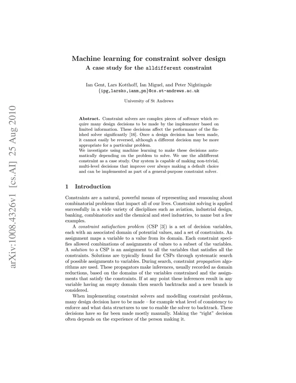 Constraint solvers are complex pieces of software which require many design decisions to be made by the implementer based on limited information. These decisions affect the performance of the finished solver significantly. Once a design decision has been made, it cannot easily be reversed, although a different decision may be more appropriate for a particular problem. We investigate using machine learning to make these decisions automatically depending on the problem to solve. We use the alldifferent constraint as a case study. Our system is capable of making non-trivial, multi-level decisions that improve over always making a default choice and can be implemented as part of a general-purpose constraint solver.