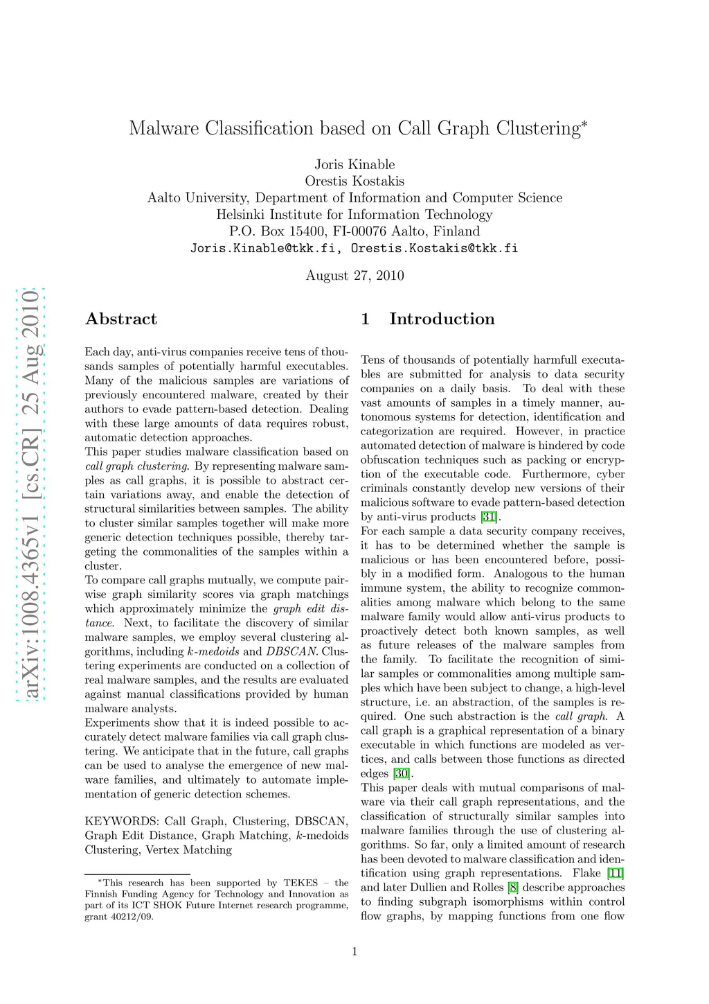 Each day, anti-virus companies receive tens of thousands samples of potentially harmful executables. Many of the malicious samples are variations of previously encountered malware, created by their authors to evade pattern-based detection. Dealing with these large amounts of data requires robust, automatic detection approaches. This paper studies malware classification based on call graph clustering. By representing malware samples as call graphs, it is possible to abstract certain variations away, and enable the detection of structural similarities between samples. The ability to cluster similar samples together will make more generic detection techniques possible, thereby targeting the commonalities of the samples within a cluster. To compare call graphs mutually, we compute pairwise graph similarity scores via graph matchings which approximately minimize the graph edit distance. Next, to facilitate the discovery of similar malware samples, we employ several clustering algorithms, including k-medoids and DBSCAN. Clustering experiments are conducted on a collection of real malware samples, and the results are evaluated against manual classifications provided by human malware analysts. Experiments show that it is indeed possible to accurately detect malware families via call graph clustering. We anticipate that in the future, call graphs can be used to analyse the emergence of new malware families, and ultimately to automate implementation of generic detection schemes.