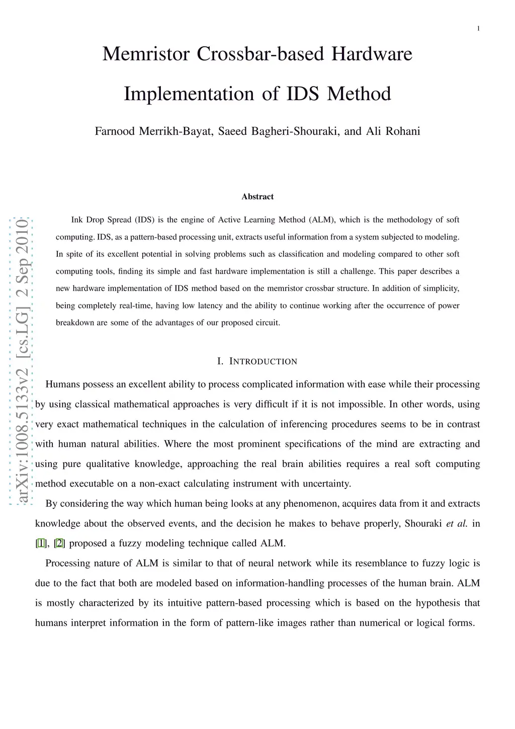 Ink Drop Spread (IDS) is the engine of Active Learning Method (ALM), which is the methodology of soft computing. IDS, as a pattern-based processing unit, extracts useful information from a system subjected to modeling. In spite of its excellent potential in solving problems such as classification and modeling compared to other soft computing tools, finding its simple and fast hardware implementation is still a challenge. This paper describes a new hardware implementation of IDS method based on the memristor crossbar structure. In addition of simplicity, being completely real-time, having low latency and the ability to continue working after the occurrence of power breakdown are some of the advantages of our proposed circuit.