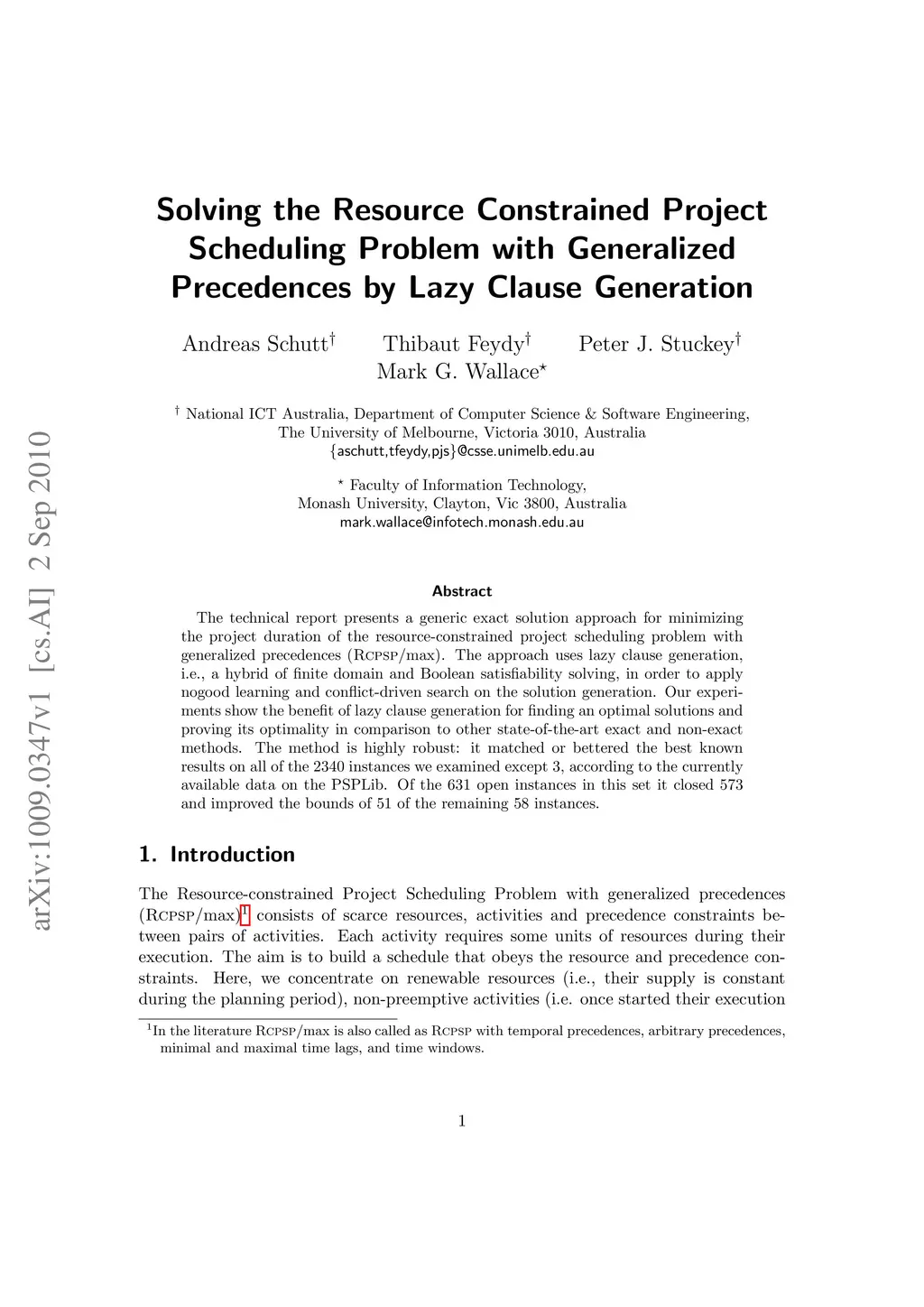 The technical report presents a generic exact solution approach for minimizing the project duration of the resource-constrained project scheduling problem with generalized precedences (Rcpsp/max). The approach uses lazy clause generation, i.e., a hybrid of finite domain and Boolean satisfiability solving, in order to apply nogood learning and conflict-driven search on the solution generation. Our experiments show the benefit of lazy clause generation for finding an optimal solutions and proving its optimality in comparison to other state-of-the-art exact and non-exact methods. The method is highly robust: it matched or bettered the best known results on all of the 2340 instances we examined except 3, according to the currently available data on the PSPLib. Of the 631 open instances in this set it closed 573 and improved the bounds of 51 of the remaining 58 instances.