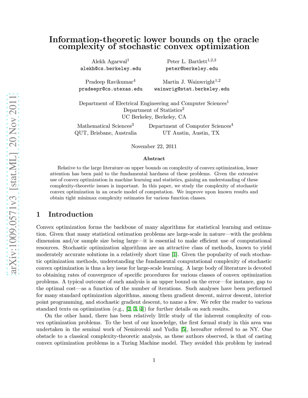 Relative to the large literature on upper bounds on complexity of convex optimization, lesser attention has been paid to the fundamental hardness of these problems. Given the extensive use of convex optimization in machine learning and statistics, gaining an understanding of these complexity-theoretic issues is important. In this paper, we study the complexity of stochastic convex optimization in an oracle model of computation. We improve upon known results and obtain tight minimax complexity estimates for various function classes.