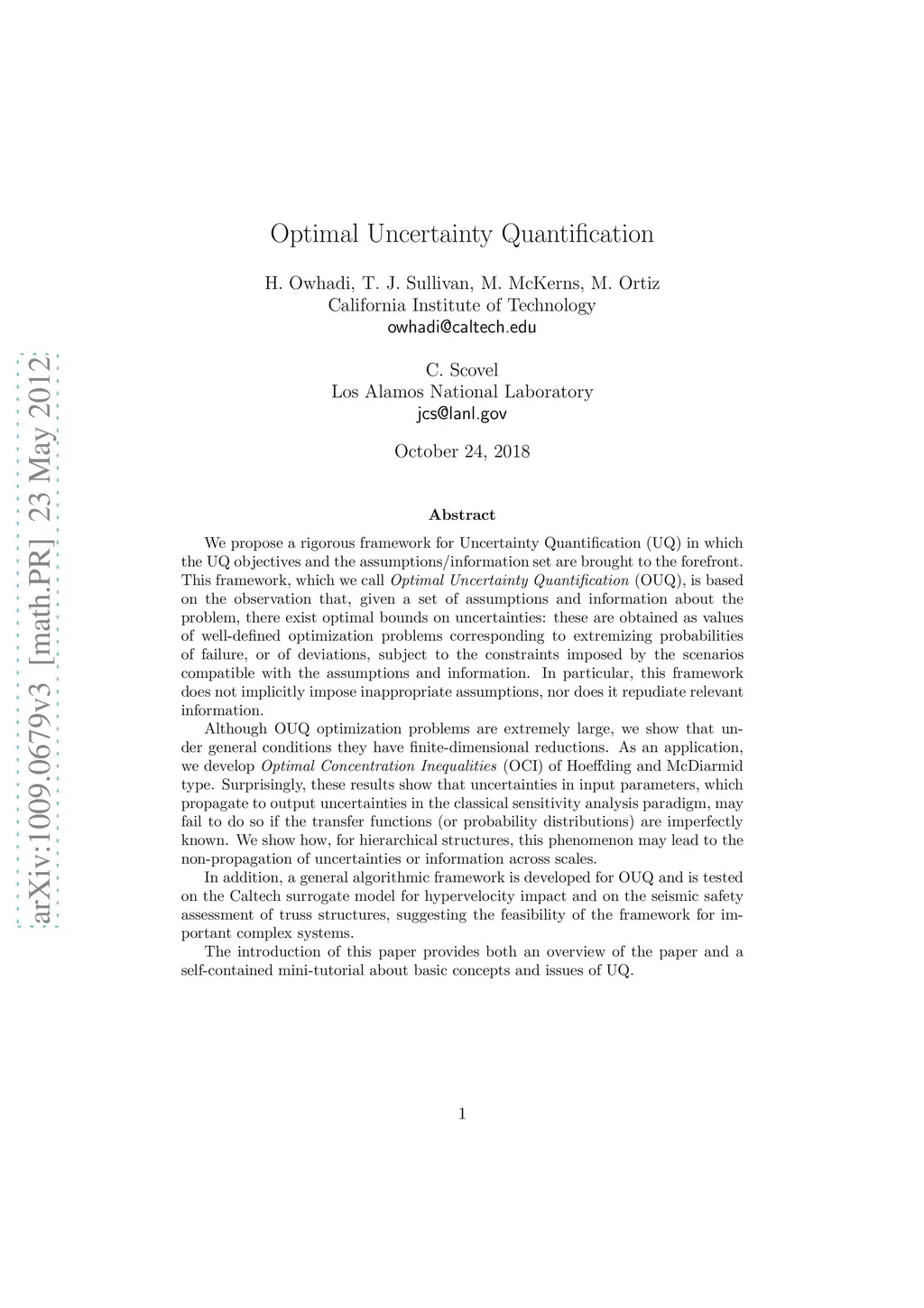 We propose a rigorous framework for Uncertainty Quantification (UQ) in which the UQ objectives and the assumptions/information set are brought to the forefront. This framework, which we call \emph{Optimal Uncertainty Quantification} (OUQ), is based on the observation that, given a set of assumptions and information about the problem, there exist optimal bounds on uncertainties: these are obtained as values of well-defined optimization problems corresponding to extremizing probabilities of failure, or of deviations, subject to the constraints imposed by the scenarios compatible with the assumptions and information. In particular, this framework does not implicitly impose inappropriate assumptions, nor does it repudiate relevant information. Although OUQ optimization problems are extremely large, we show that under general conditions they have finite-dimensional reductions. As an application, we develop \emph{Optimal Concentration Inequalities} (OCI) of Hoeffding and McDiarmid type. Surprisingly, these results show that uncertainties in input parameters, which propagate to output uncertainties in the classical sensitivity analysis paradigm, may fail to do so if the transfer functions (or probability distributions) are imperfectly known. We show how, for hierarchical structures, this phenomenon may lead to the non-propagation of uncertainties or information across scales. In addition, a general algorithmic framework is developed for OUQ and is tested on the Caltech surrogate model for hypervelocity impact and on the seismic safety assessment of truss structures, suggesting the feasibility of the framework for important complex systems. The introduction of this paper provides both an overview of the paper and a self-contained mini-tutorial about basic concepts and issues of UQ.