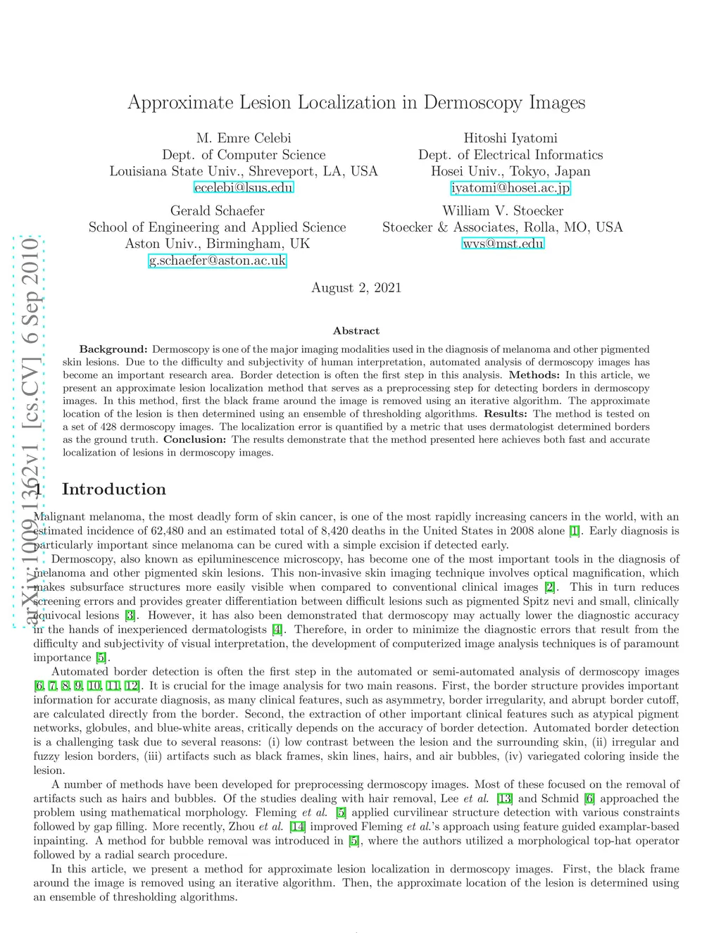 Background: Dermoscopy is one of the major imaging modalities used in the diagnosis of melanoma and other pigmented skin lesions. Due to the difficulty and subjectivity of human interpretation, automated analysis of dermoscopy images has become an important research area. Border detection is often the first step in this analysis. Methods: In this article, we present an approximate lesion localization method that serves as a preprocessing step for detecting borders in dermoscopy images. In this method, first the black frame around the image is removed using an iterative algorithm. The approximate location of the lesion is then determined using an ensemble of thresholding algorithms. Results: The method is tested on a set of 428 dermoscopy images. The localization error is quantified by a metric that uses dermatologist determined borders as the ground truth. Conclusion: The results demonstrate that the method presented here achieves both fast and accurate localization of lesions in dermoscopy images.