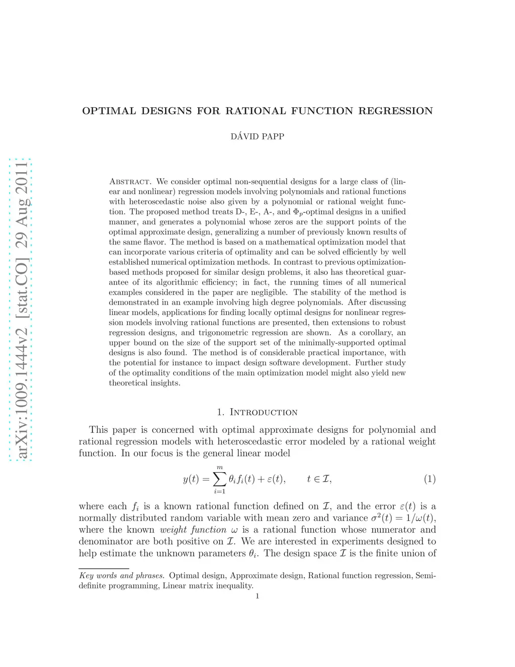 We consider optimal non-sequential designs for a large class of (linear and nonlinear) regression models involving polynomials and rational functions with heteroscedastic noise also given by a polynomial or rational weight function. The proposed method treats D-, E-, A-, and -optimal designs in a unified manner, and generates a polynomial whose zeros are the support points of the optimal approximate design, generalizing a number of previously known results of the same flavor. The method is based on a mathematical optimization model that can incorporate various criteria of optimality and can be solved efficiently by well established numerical optimization methods. In contrast to previous optimization-based methods proposed for similar design problems, it also has theoretical guarantee of its algorithmic efficiency; in fact, the running times of all numerical examples considered in the paper are negligible. The stability of the method is demonstrated in an example involving high degree polynomials. After discussing linear models, applications for finding locally optimal designs for nonlinear regression models involving rational functions are presented, then extensions to robust regression designs, and trigonometric regression are shown. As a corollary, an upper bound on the size of the support set of the minimally-supported optimal designs is also found. The method is of considerable practical importance, with the potential for instance to impact design software development. Further study of the optimality conditions of the main optimization model might also yield new theoretical insights.